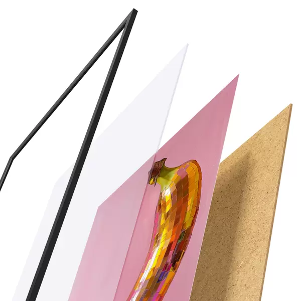 Plakatą sudaro rėmas, pleksiklas, atspausdintas vaizdas ir medžio drožlių plokštės pagrindas. Plakatą galima iš karto pakabinti ant sienos dėl kitoje pusėje esančių laikiklių.