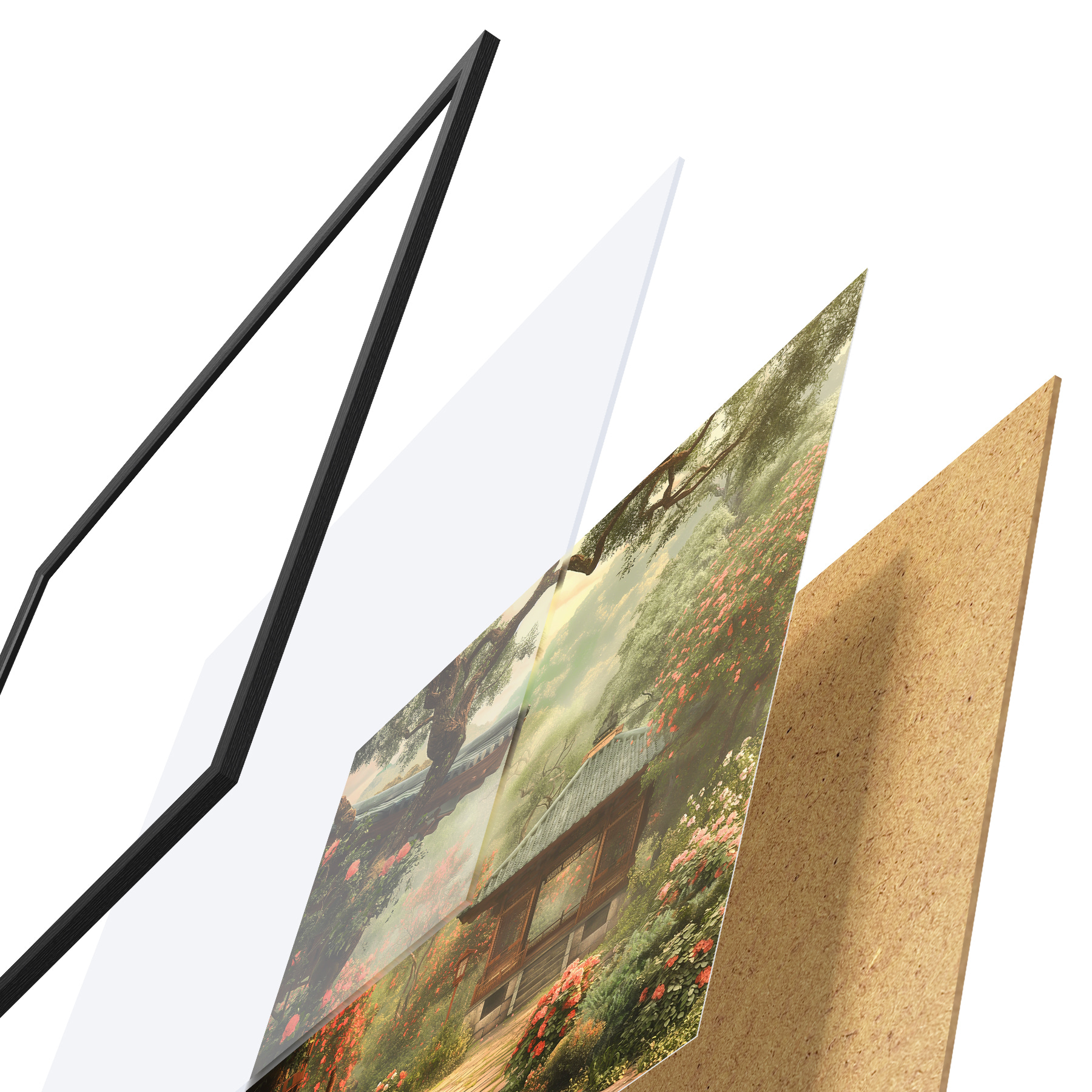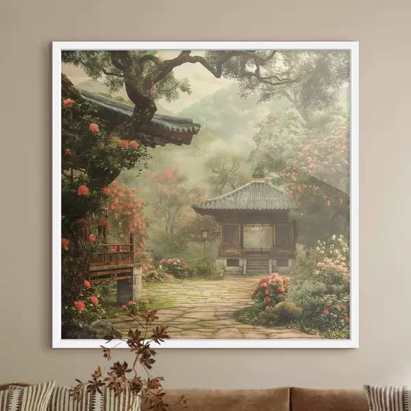 Plakatas Japoniškas parkas su žydinčiais medžiais ir gėlėmis, miškas, medinis namas f39773