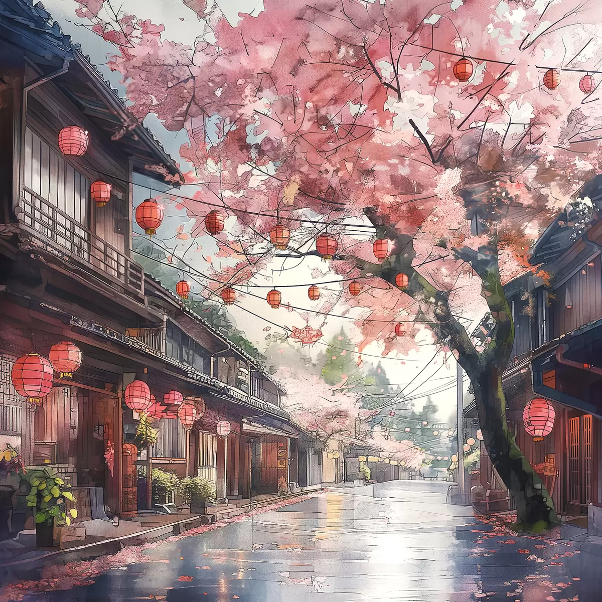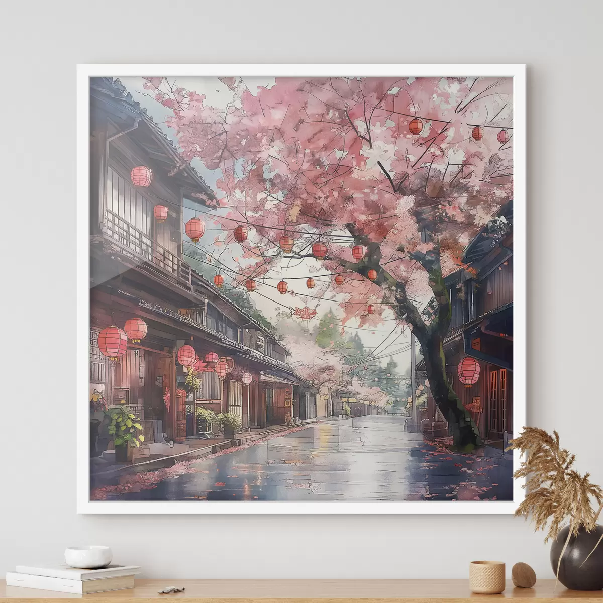 Plakatas Japoniška gatvė su žydinčiomis vyšniomis, rytietiška architektūra, žibintais f39774
