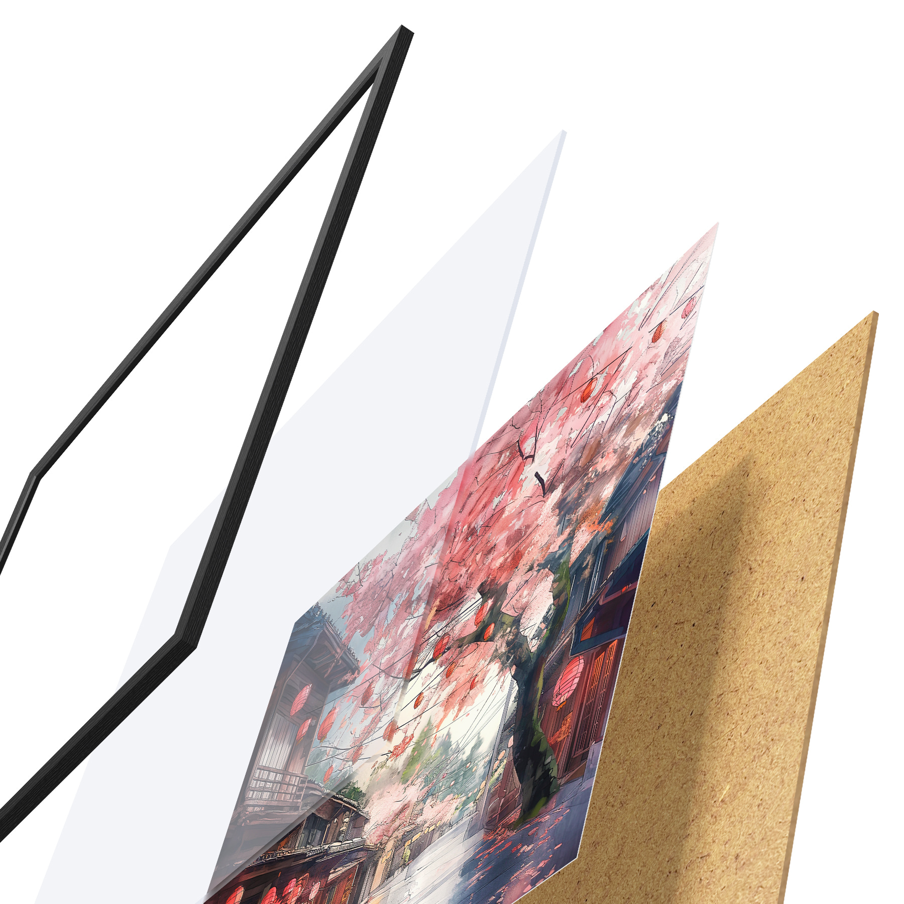 Plakatas Japoniška gatvė su žydinčiomis vyšniomis, rytietiška architektūra, žibintais Ne f39774
