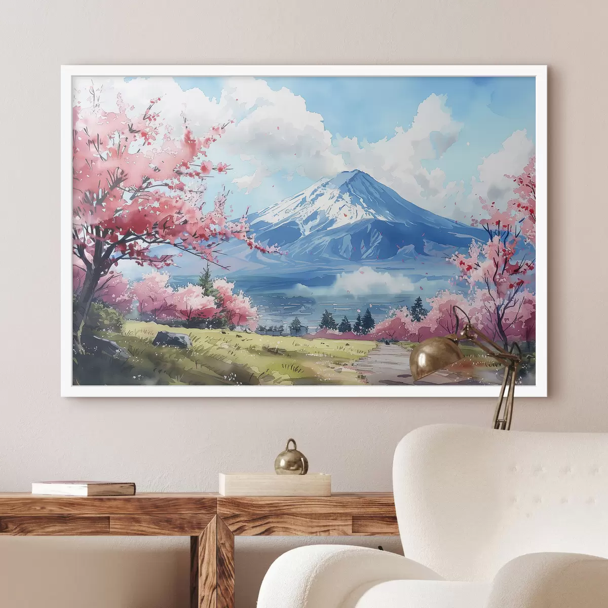 Plakatas Fudži kalnų peizažas, pavasarį žydinti gamta, vyšnios, japoniška f39777