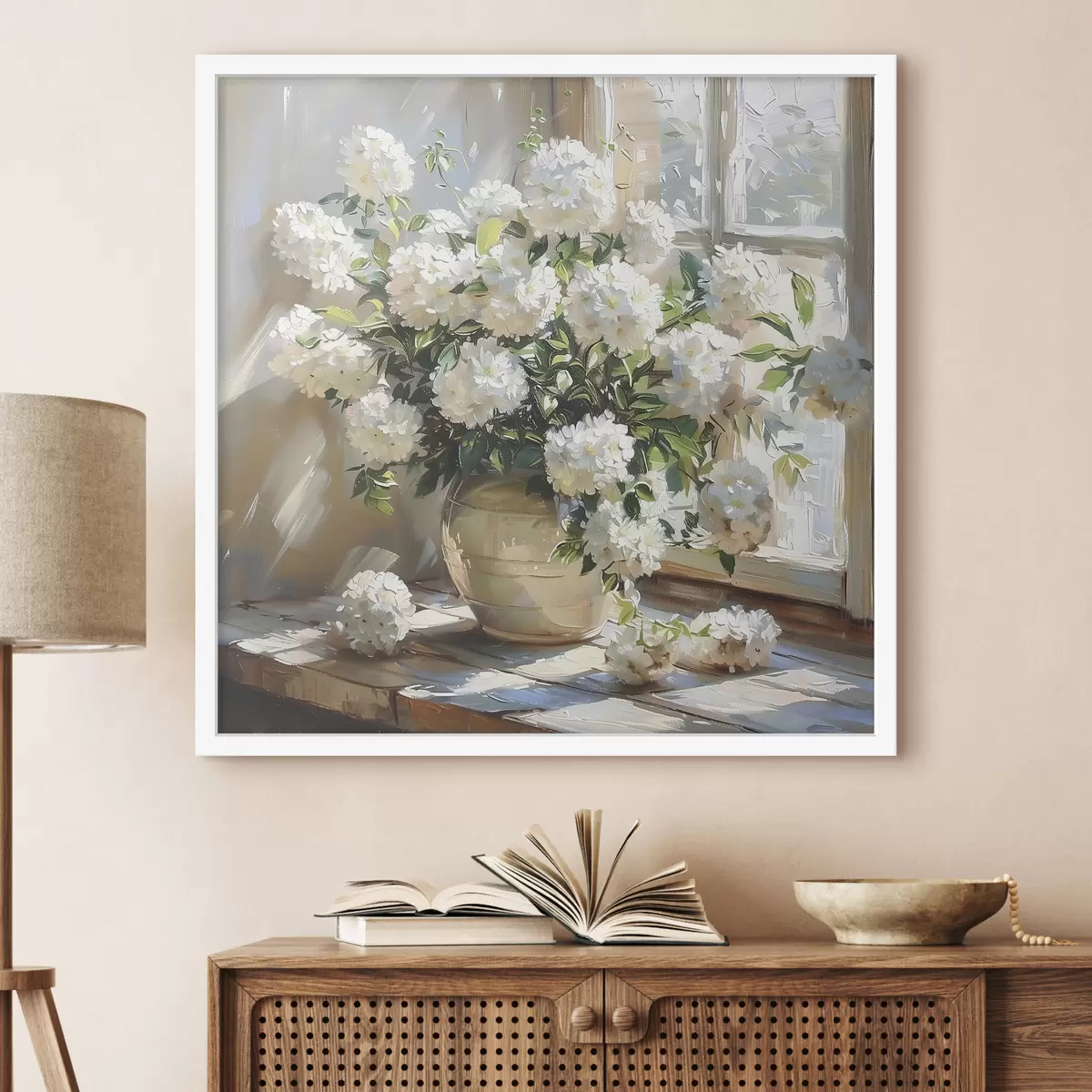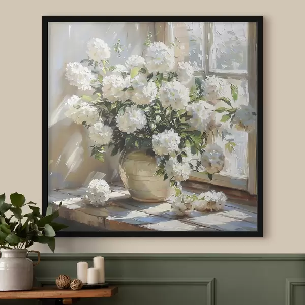 Plakatas Baltos hortenzijos vazoje, saulės šviesa lange, aliejinė tapyba Ne f39779