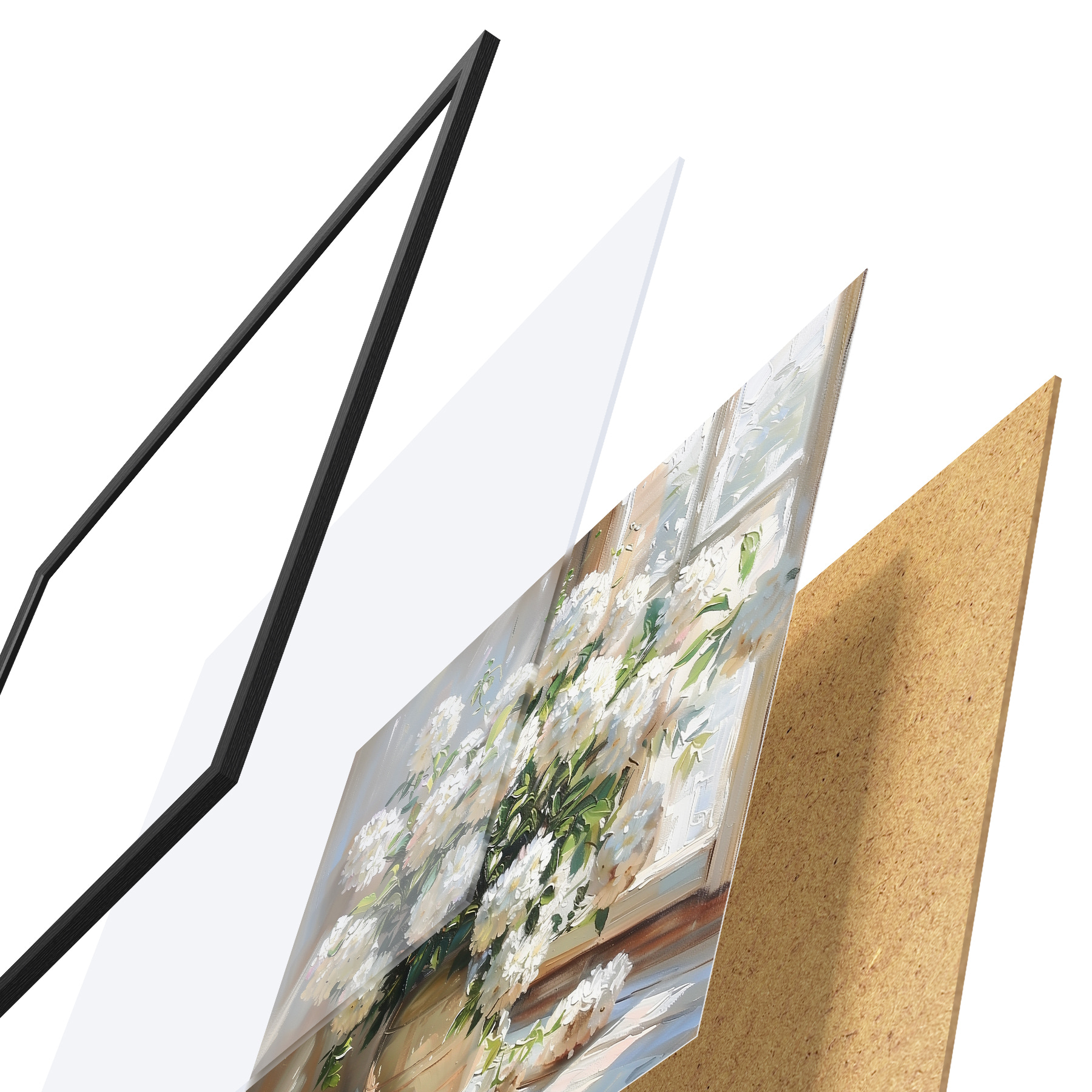Plakatą sudaro rėmas, pleksiklas, atspausdintas vaizdas ir medžio drožlių plokštės pagrindas. Plakatą galima iš karto pakabinti ant sienos dėl kitoje pusėje esančių laikiklių.