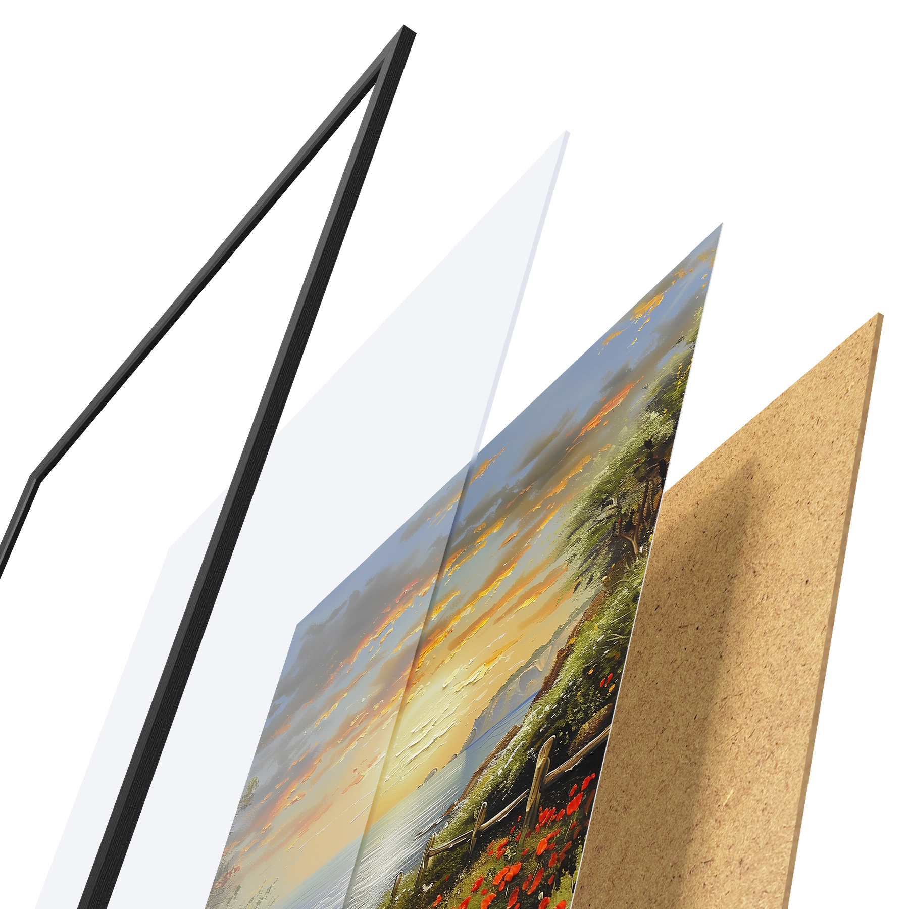 Plakatą sudaro rėmas, pleksiklas, atspausdintas vaizdas ir medžio drožlių plokštės pagrindas. Plakatą galima iš karto pakabinti ant sienos dėl kitoje pusėje esančių laikiklių.
