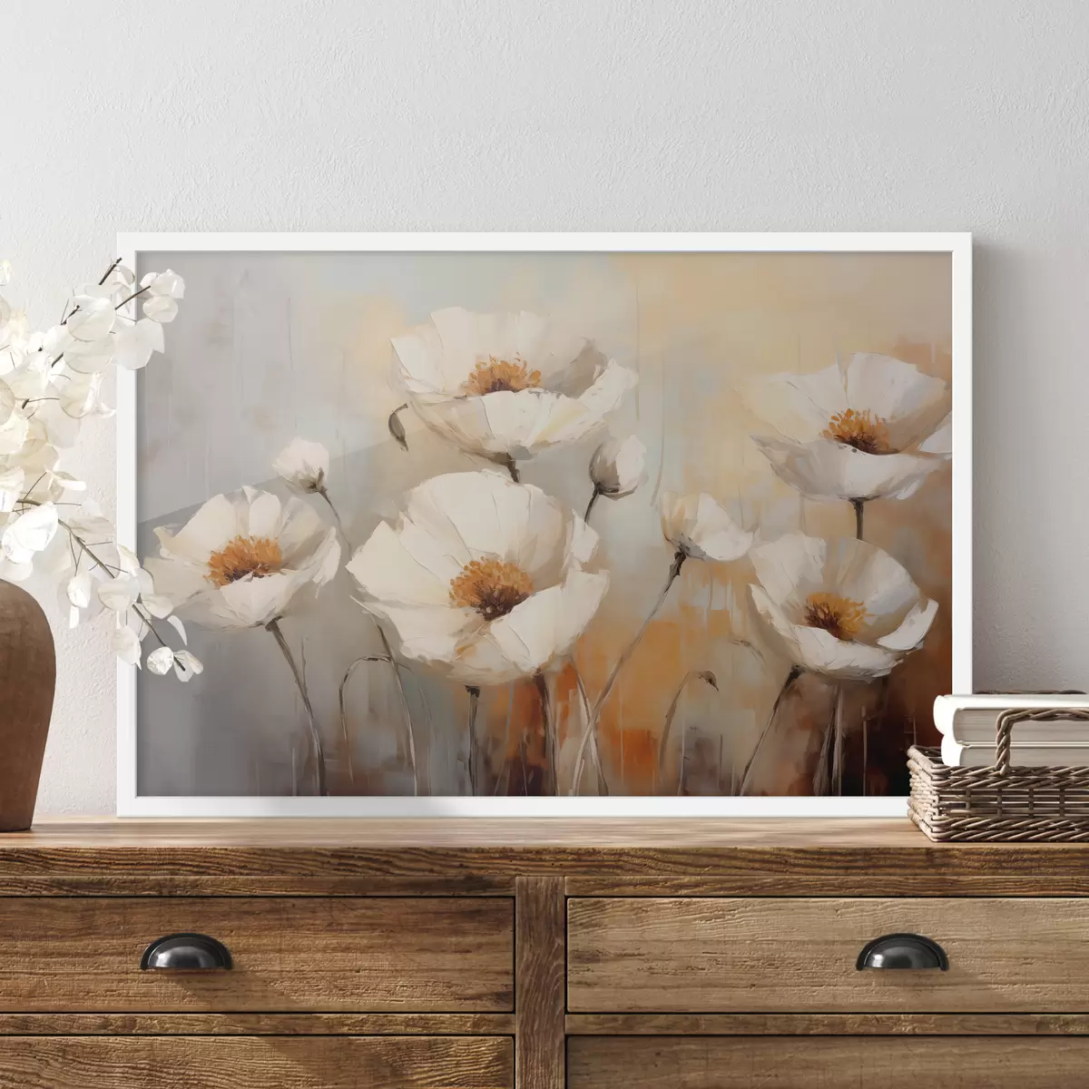 Plakatas Baltųjų aguonų aliejinė tapyba, mėlynos ir oranžinės spalvos f39815