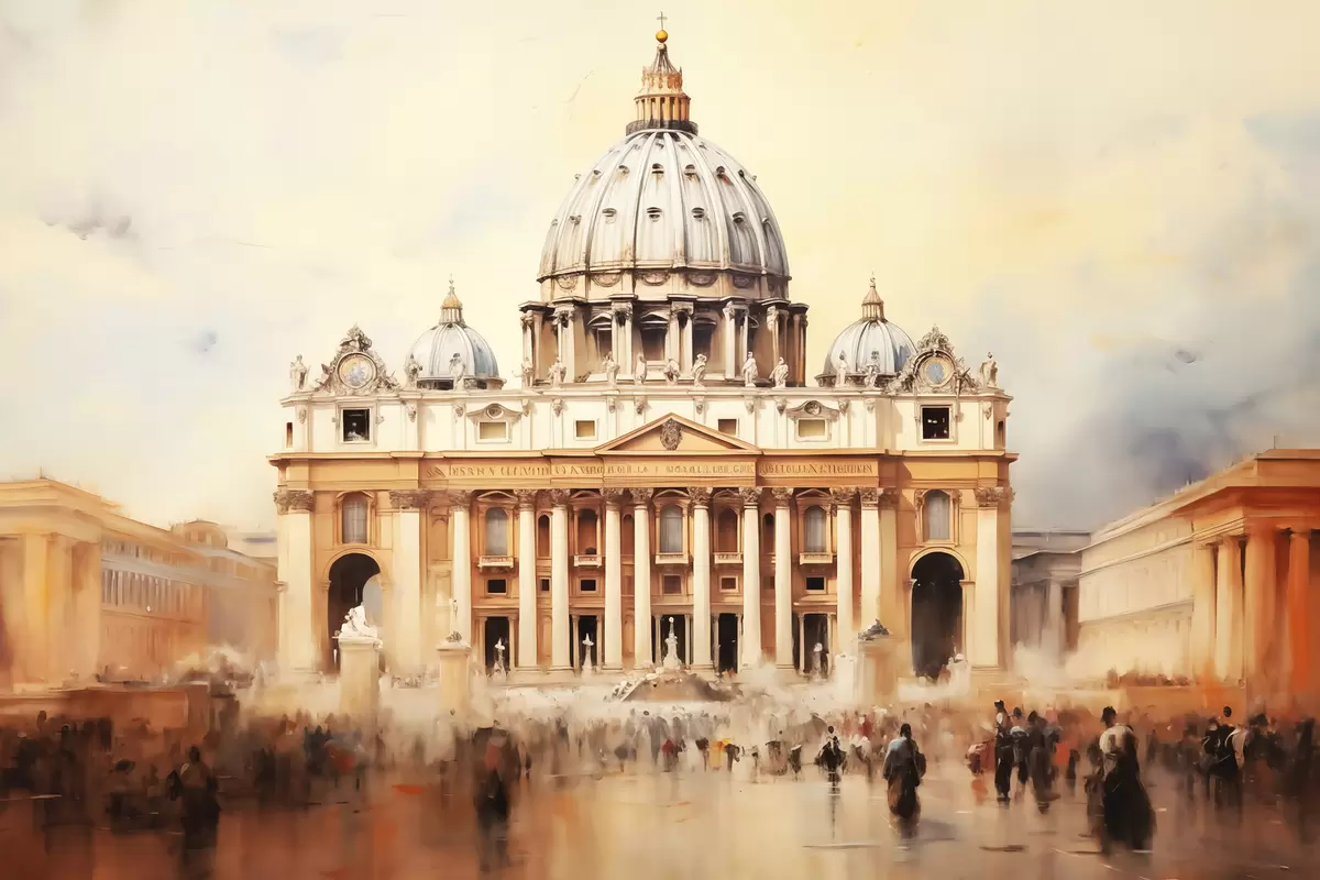 Plakatas Vatikano pastatas, žmonės vaikšto aikštėje aliejiniame paveiksle Ne f39816