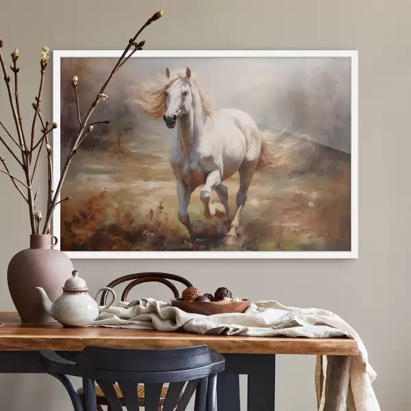 Plakatas Baltas arklys, šuoliuojantis per pievą, aliejinis paveikslas Ne f39818