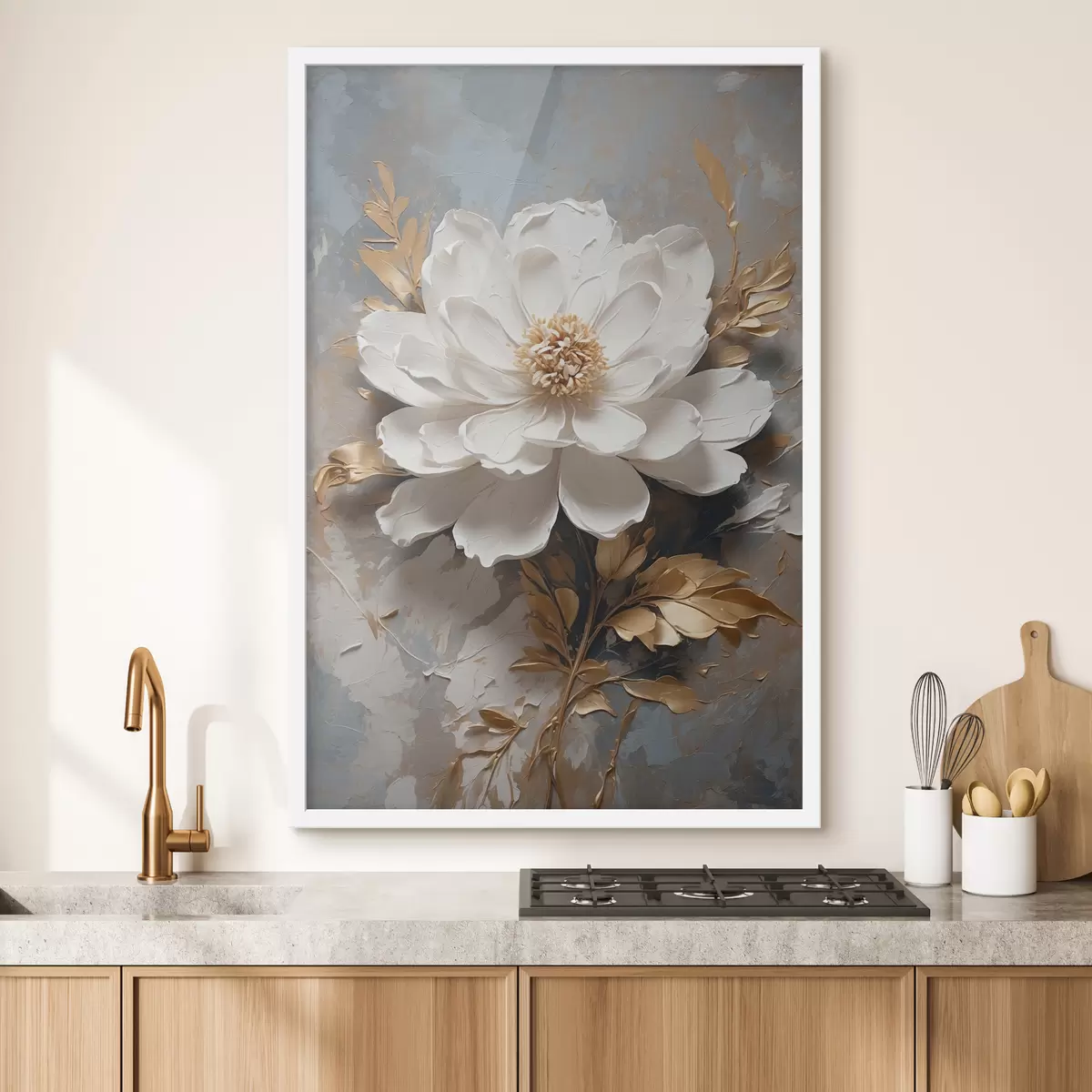 Plakatas Balta gėlė su stiebais abstrakčiame fone f39865