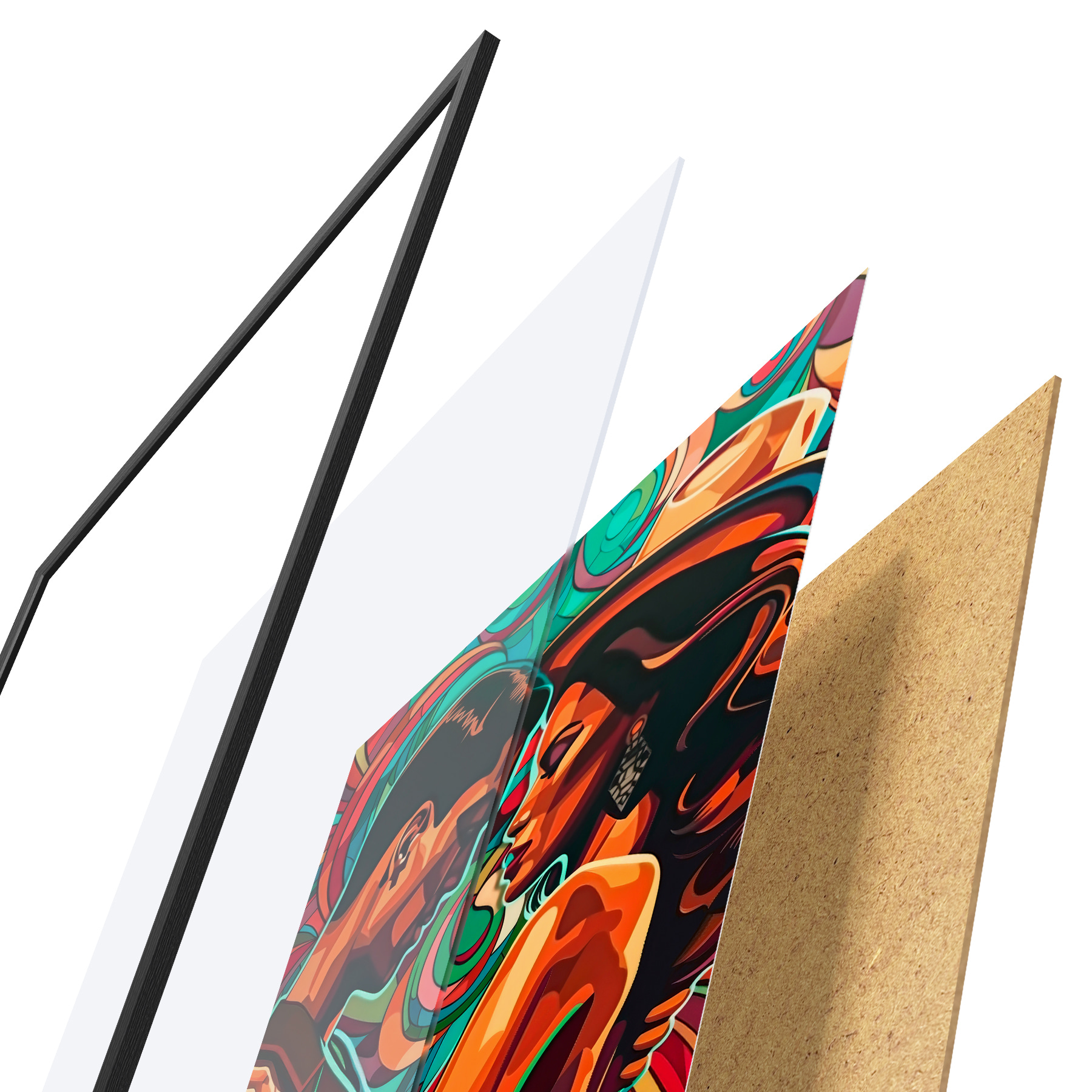 Plakatą sudaro rėmas, pleksiklas, atspausdintas vaizdas ir medžio drožlių plokštės pagrindas. Plakatą galima iš karto pakabinti ant sienos dėl kitoje pusėje esančių laikiklių.