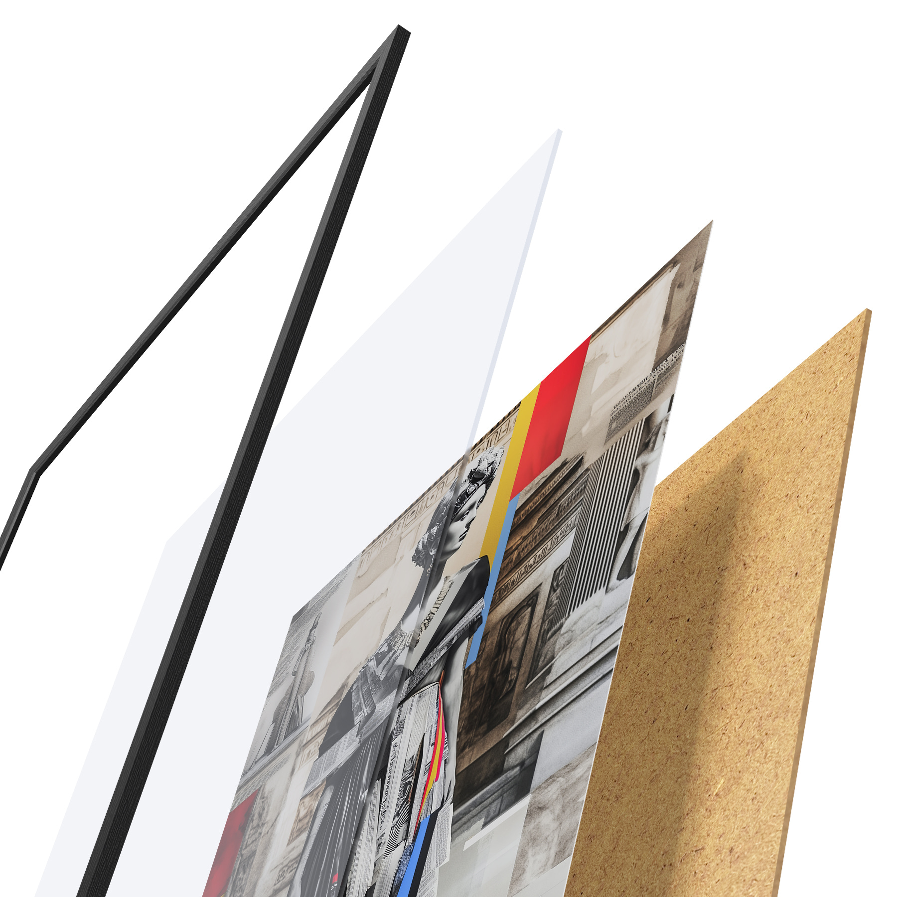 Plakatą sudaro rėmas, pleksiklas, atspausdintas vaizdas ir medžio drožlių plokštės pagrindas. Plakatą galima iš karto pakabinti ant sienos dėl kitoje pusėje esančių laikiklių.