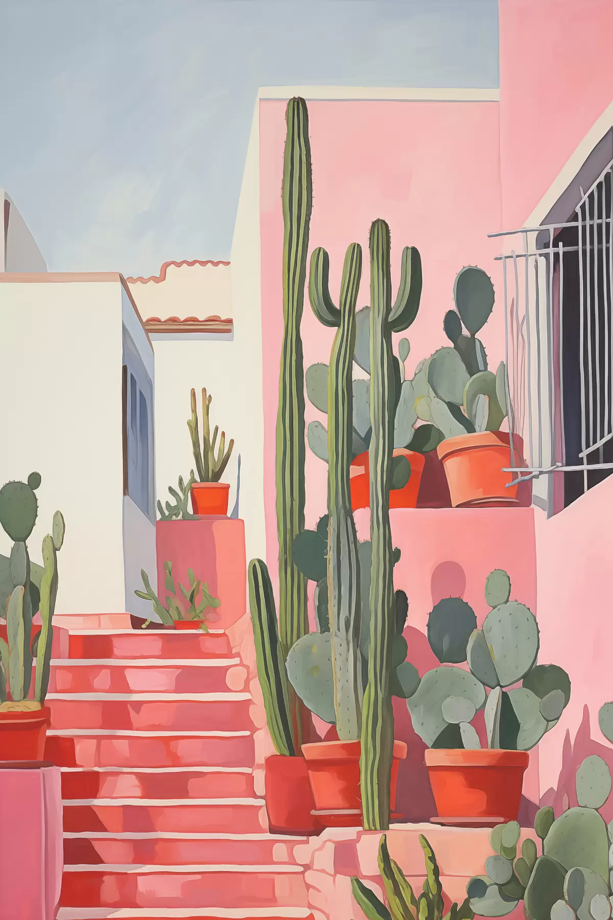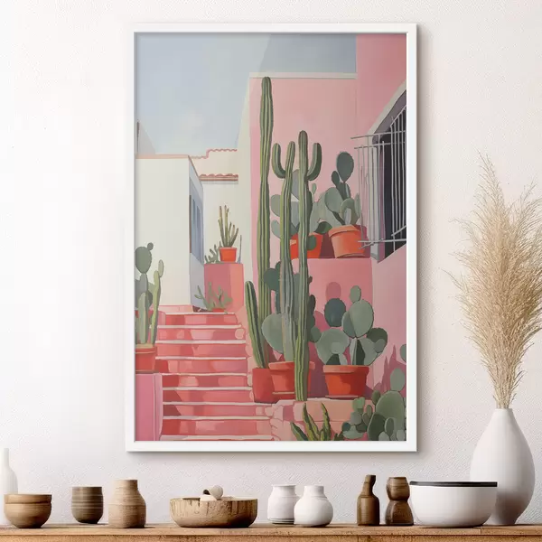 Plakatas Ilgi kaktusai rožinio namo fone ir aliejinė tapyba Ne f39926