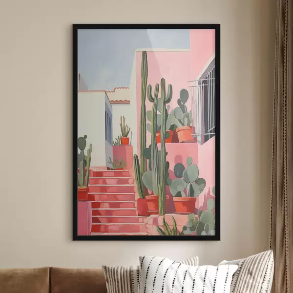 Plakatas Ilgi kaktusai rožinio namo fone ir aliejinė tapyba f39926