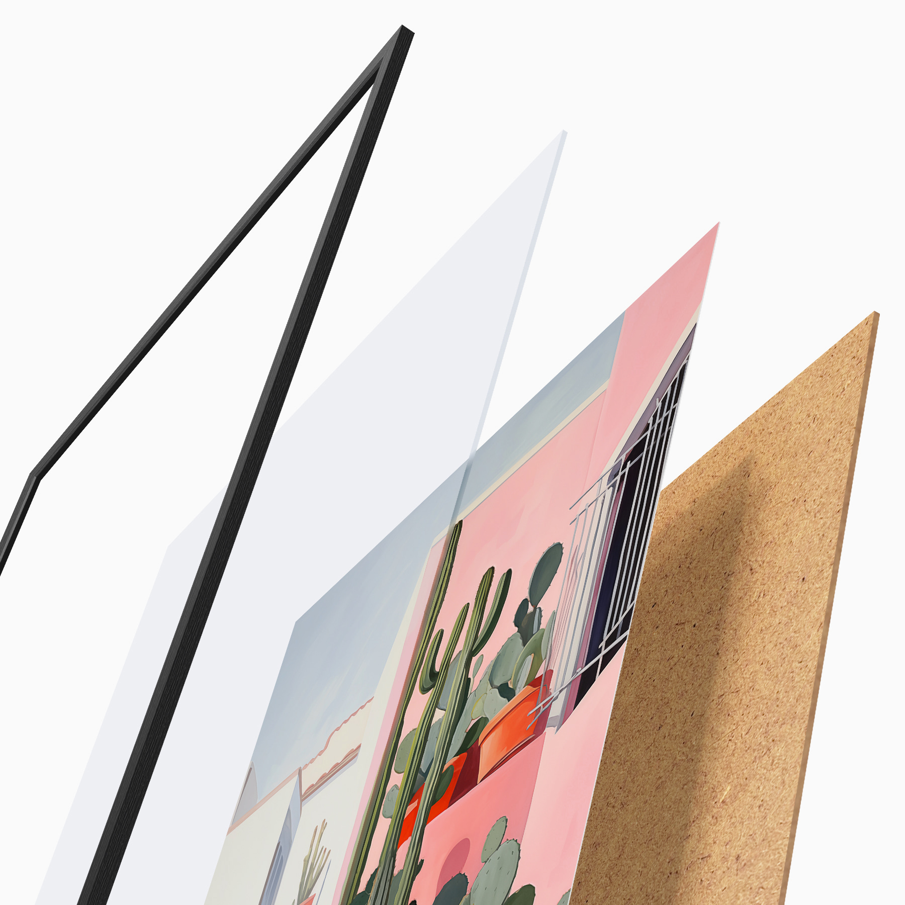 Plakatą sudaro rėmas, pleksiklas, atspausdintas vaizdas ir medžio drožlių plokštės pagrindas. Plakatą galima iš karto pakabinti ant sienos dėl kitoje pusėje esančių laikiklių.