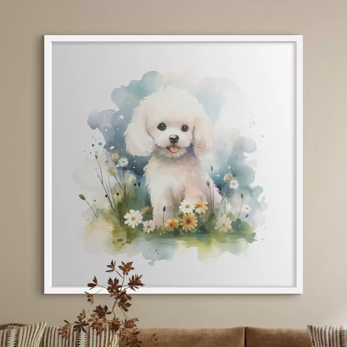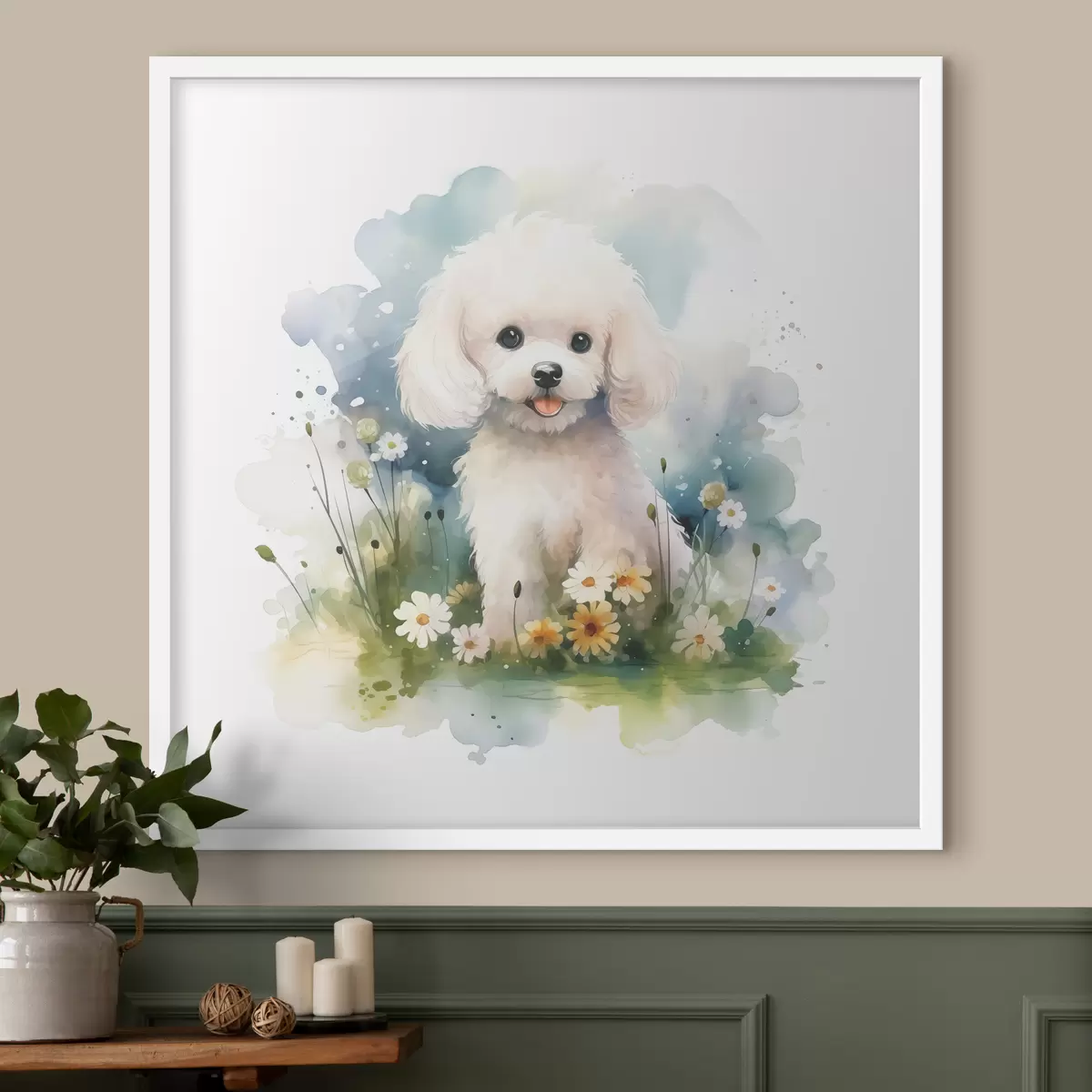 Plakatas Mažas baltas pudelis, sėdintis gėlių akvarelėje f39928