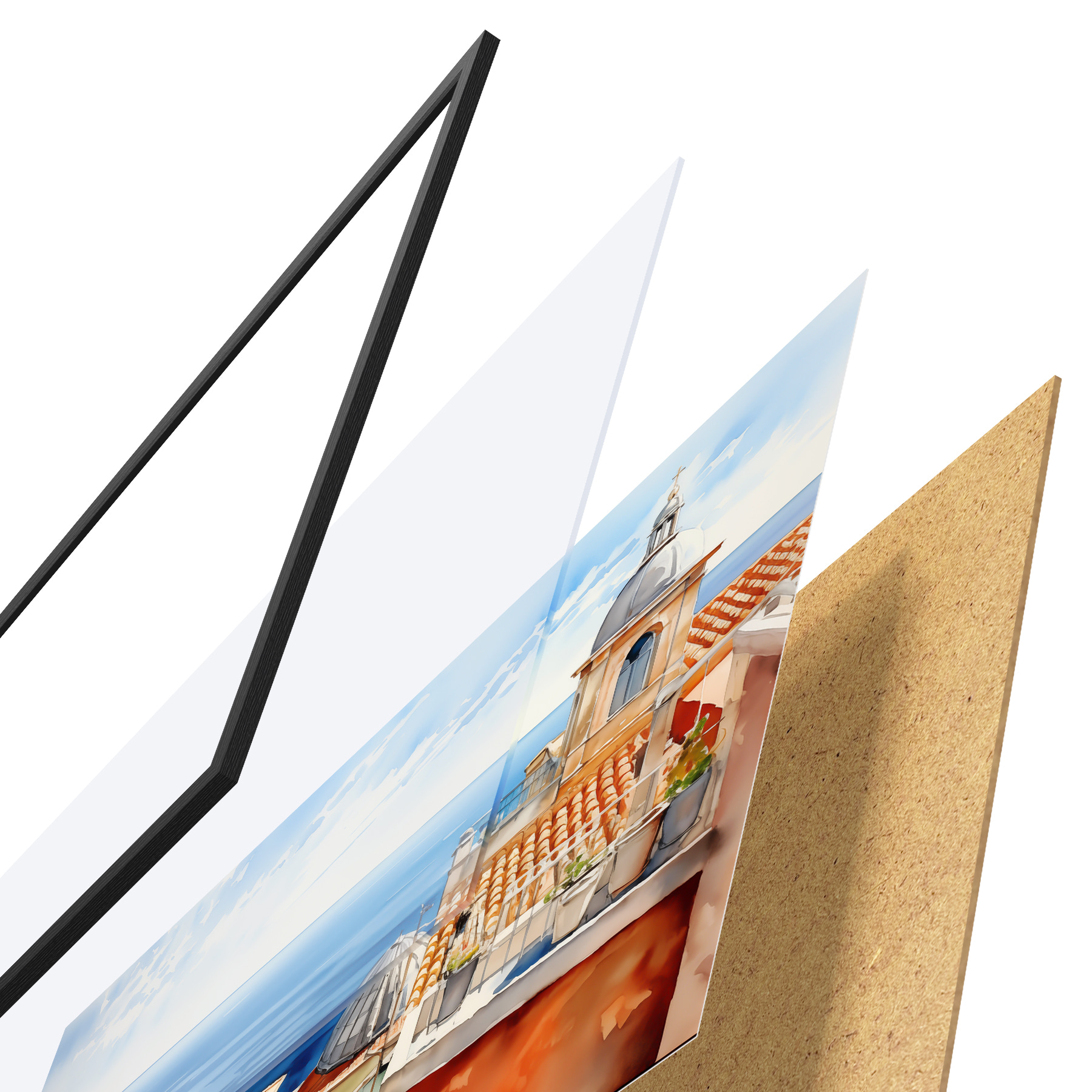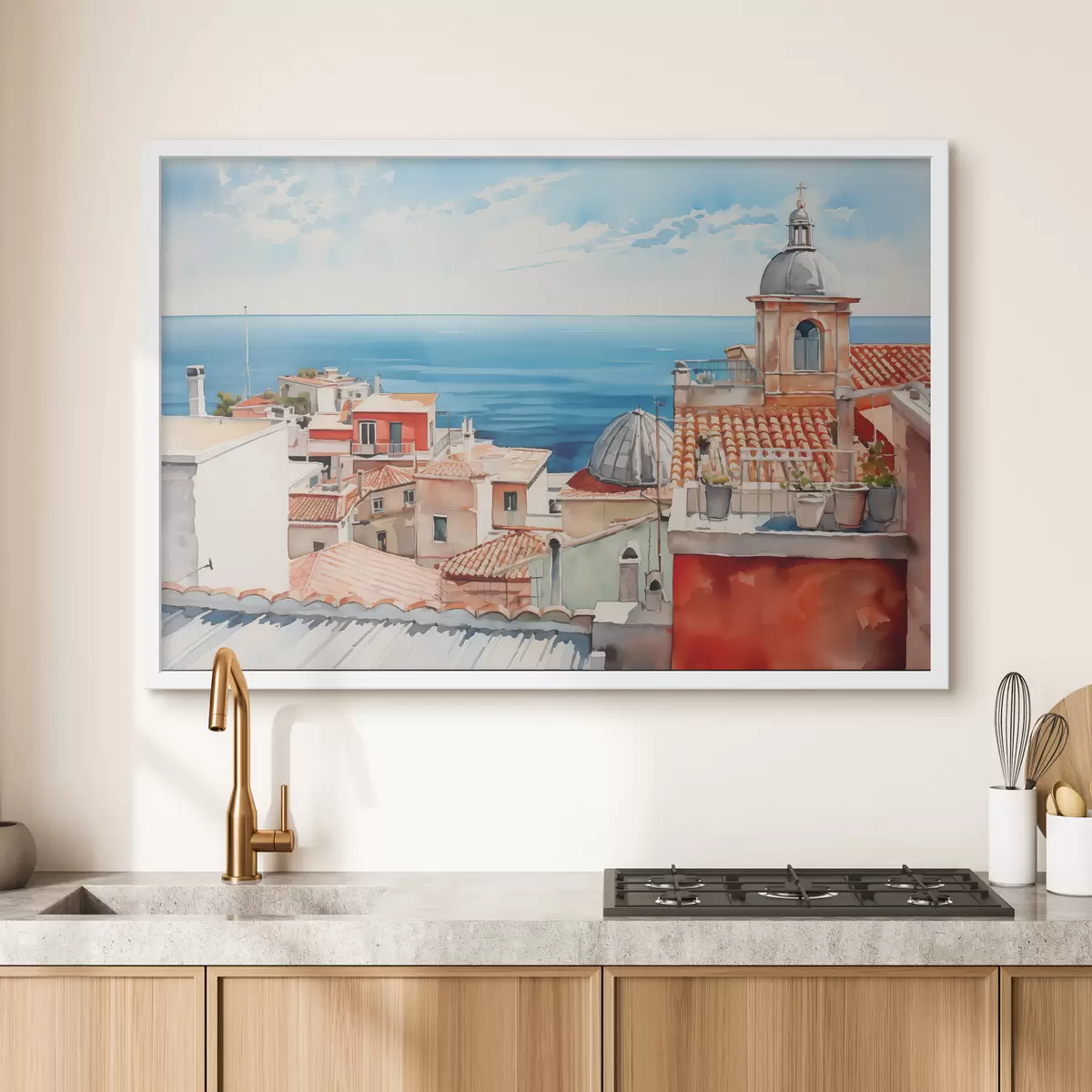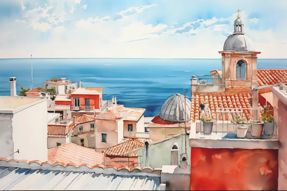 Plakatas Itališkų namų stogai jūros ir dangaus akvarelės fone f39933