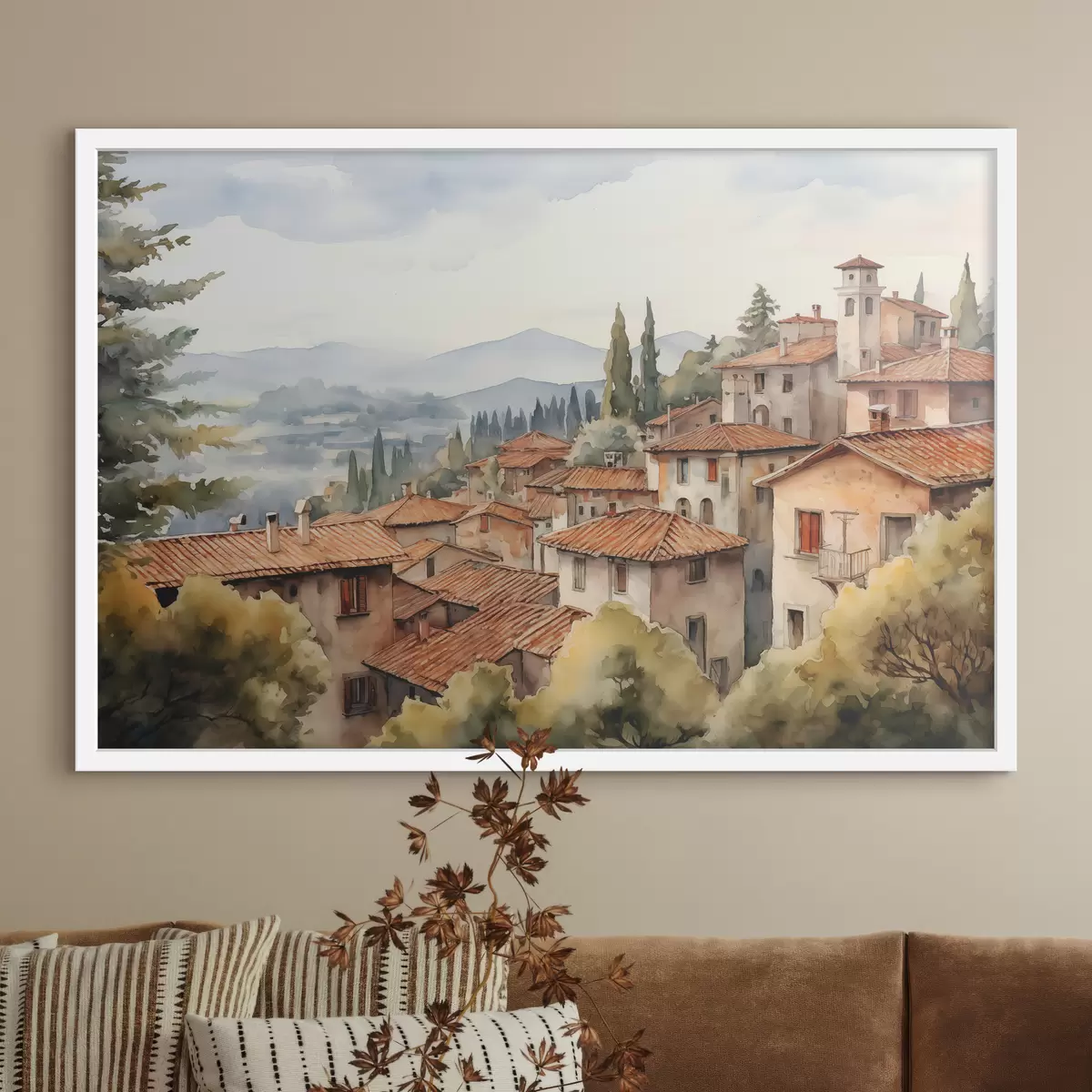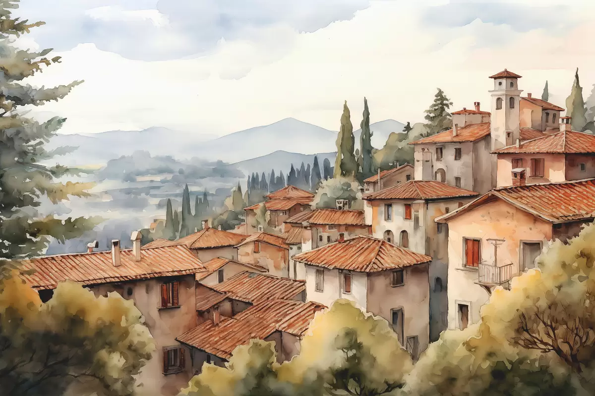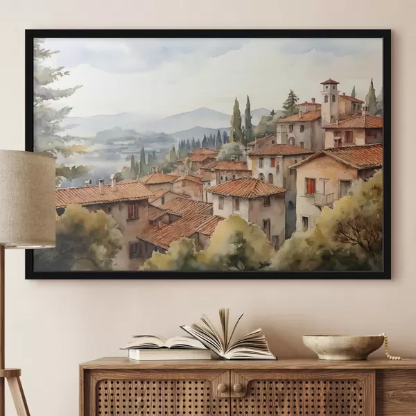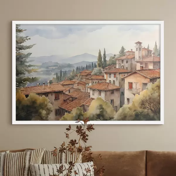 Plakatas Namai Italijos kaimuose kalnų fone, stogai, akvarelė f39934
