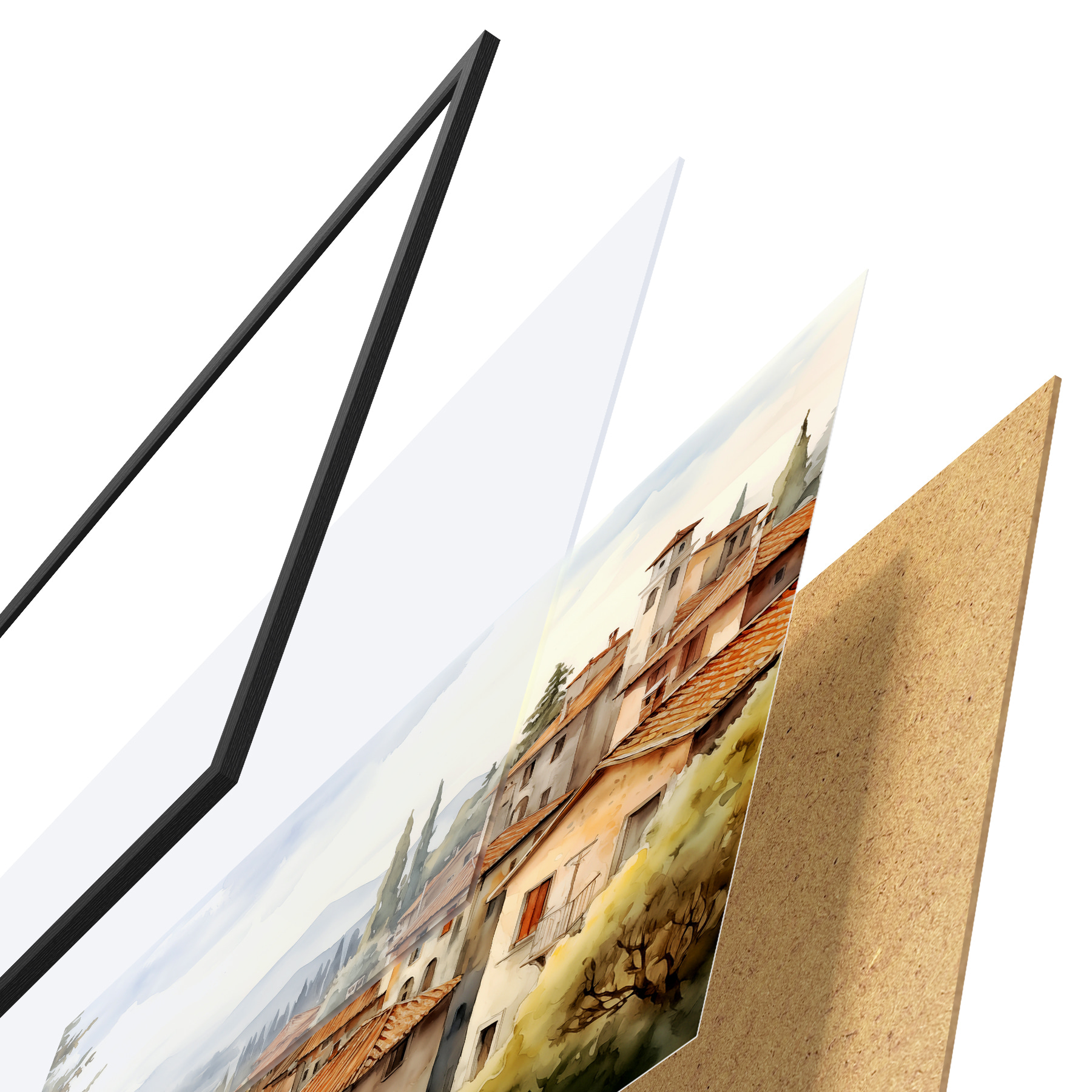 Plakatą sudaro rėmas, pleksiklas, atspausdintas vaizdas ir medžio drožlių plokštės pagrindas. Plakatą galima iš karto pakabinti ant sienos dėl kitoje pusėje esančių laikiklių.
