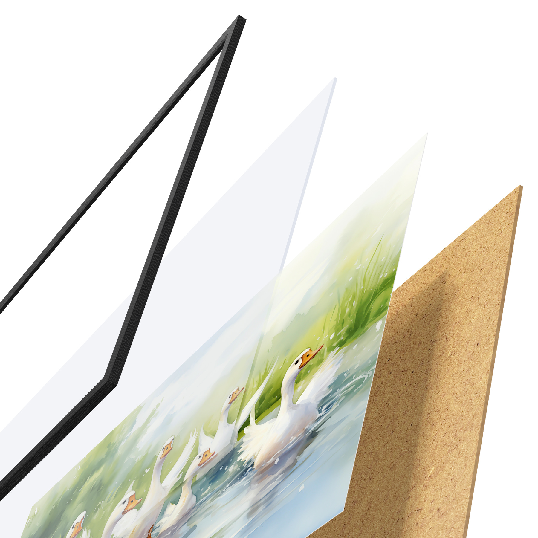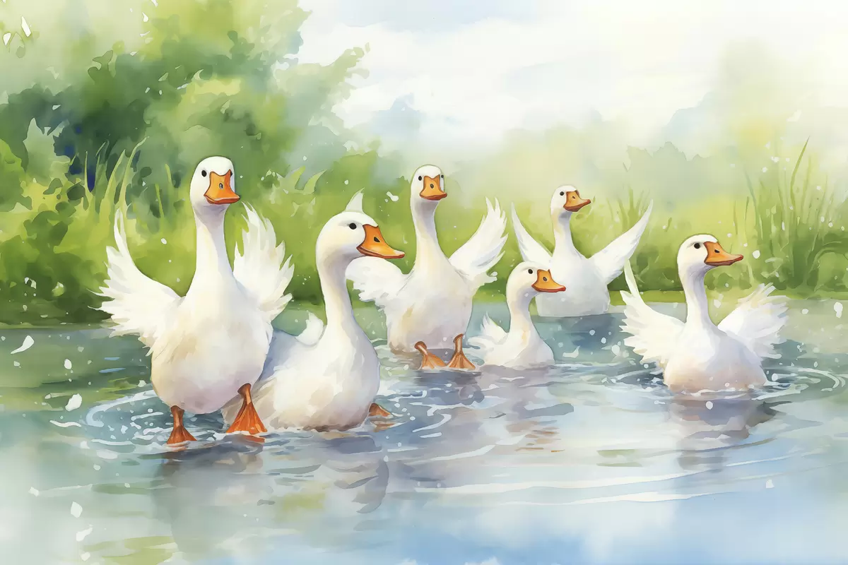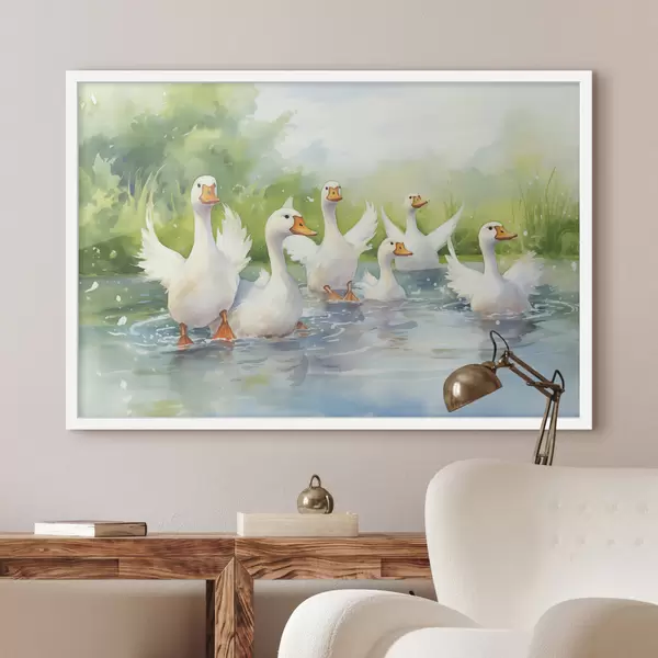 Plakatas Baltosios žąsys maudosi tvenkinyje akvarele Ne f39939