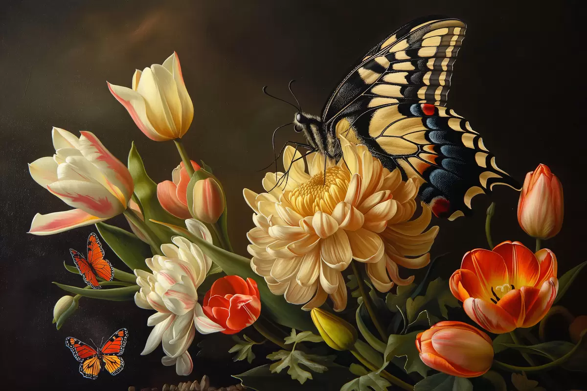 Plakatas Drugelis, puokštė, gėlės, tulpė, chrizantema f39949