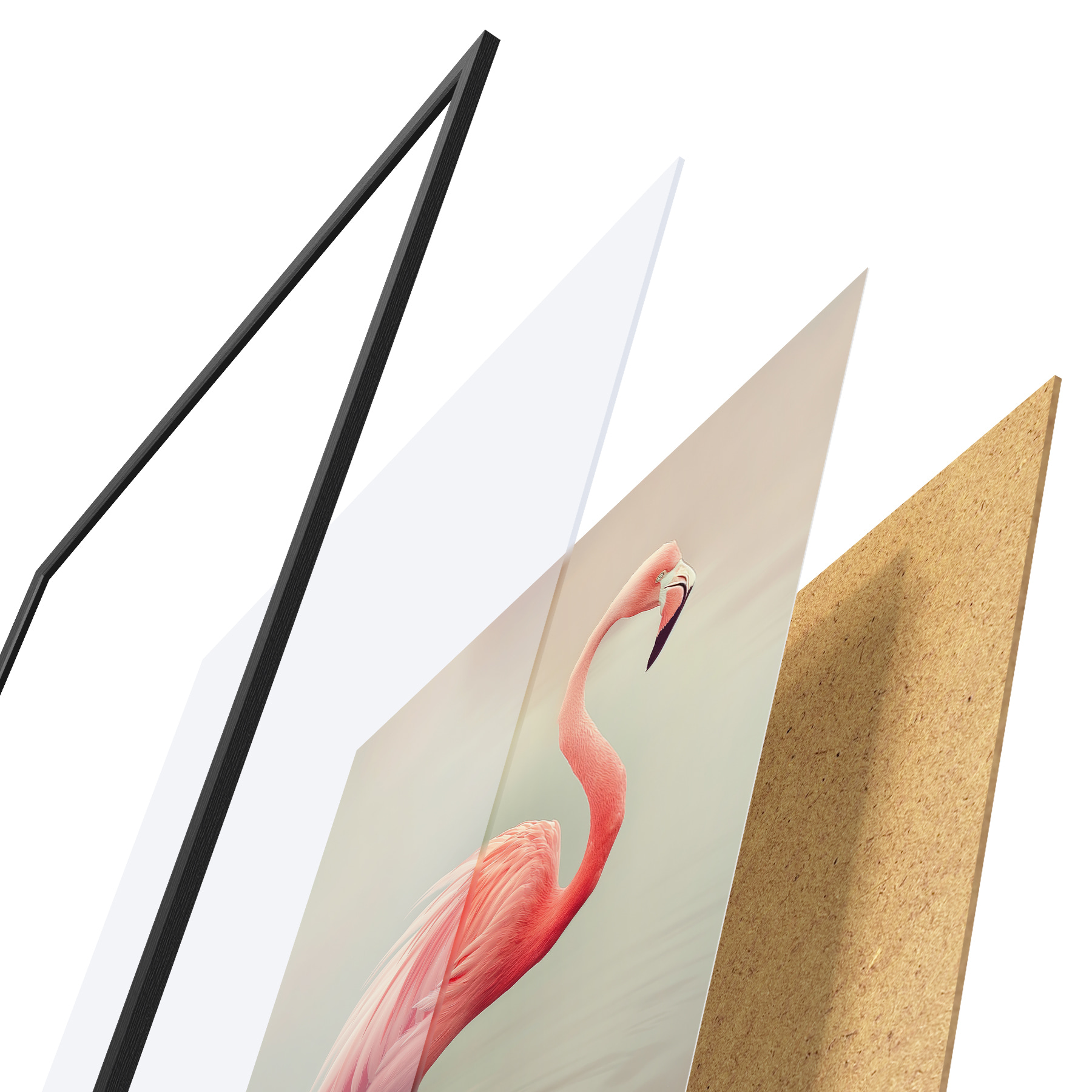Plakatą sudaro rėmas, pleksiklas, atspausdintas vaizdas ir medžio drožlių plokštės pagrindas. Plakatą galima iš karto pakabinti ant sienos dėl kitoje pusėje esančių laikiklių.