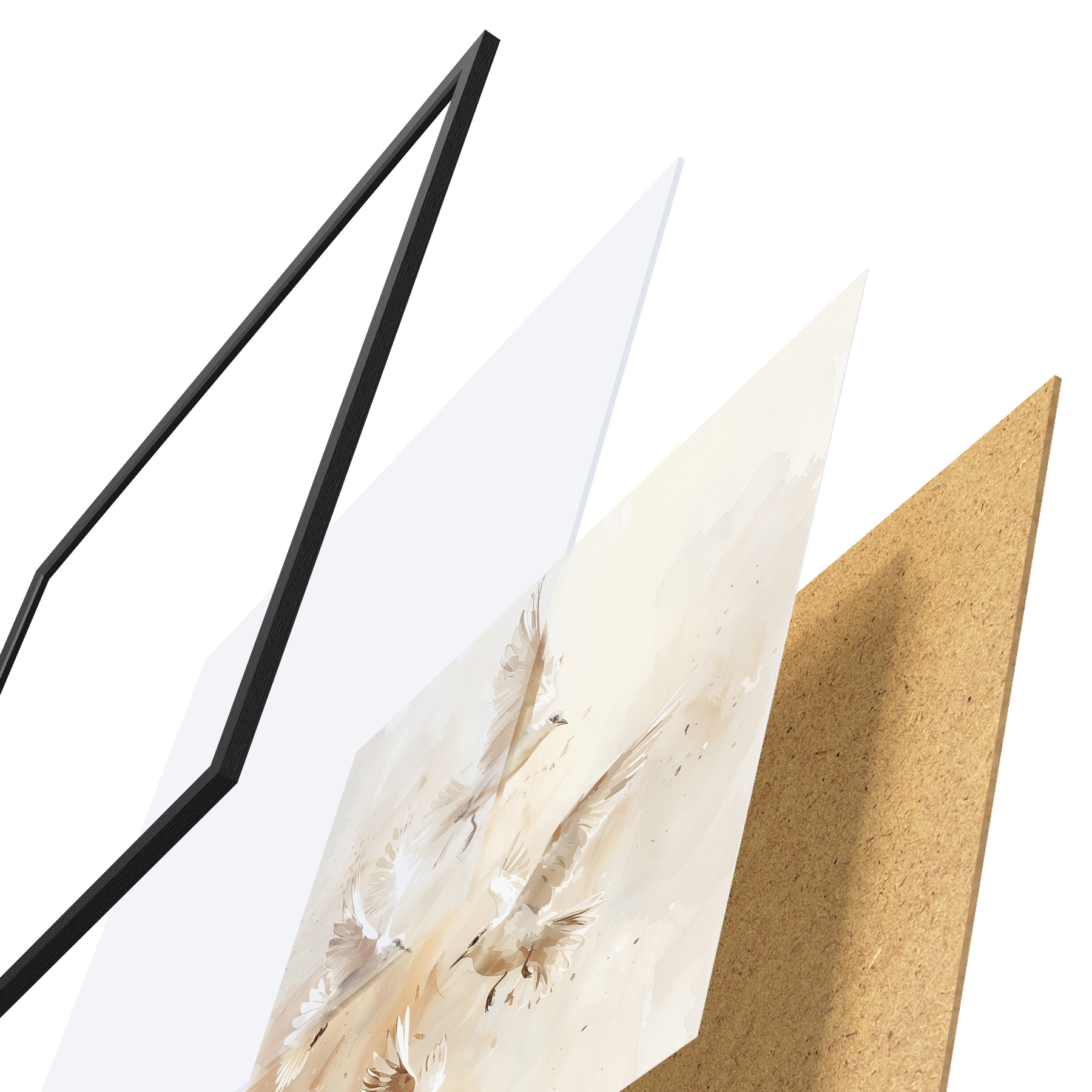 Plakatą sudaro rėmas, pleksiklas, atspausdintas vaizdas ir medžio drožlių plokštės pagrindas. Plakatą galima iš karto pakabinti ant sienos dėl kitoje pusėje esančių laikiklių.