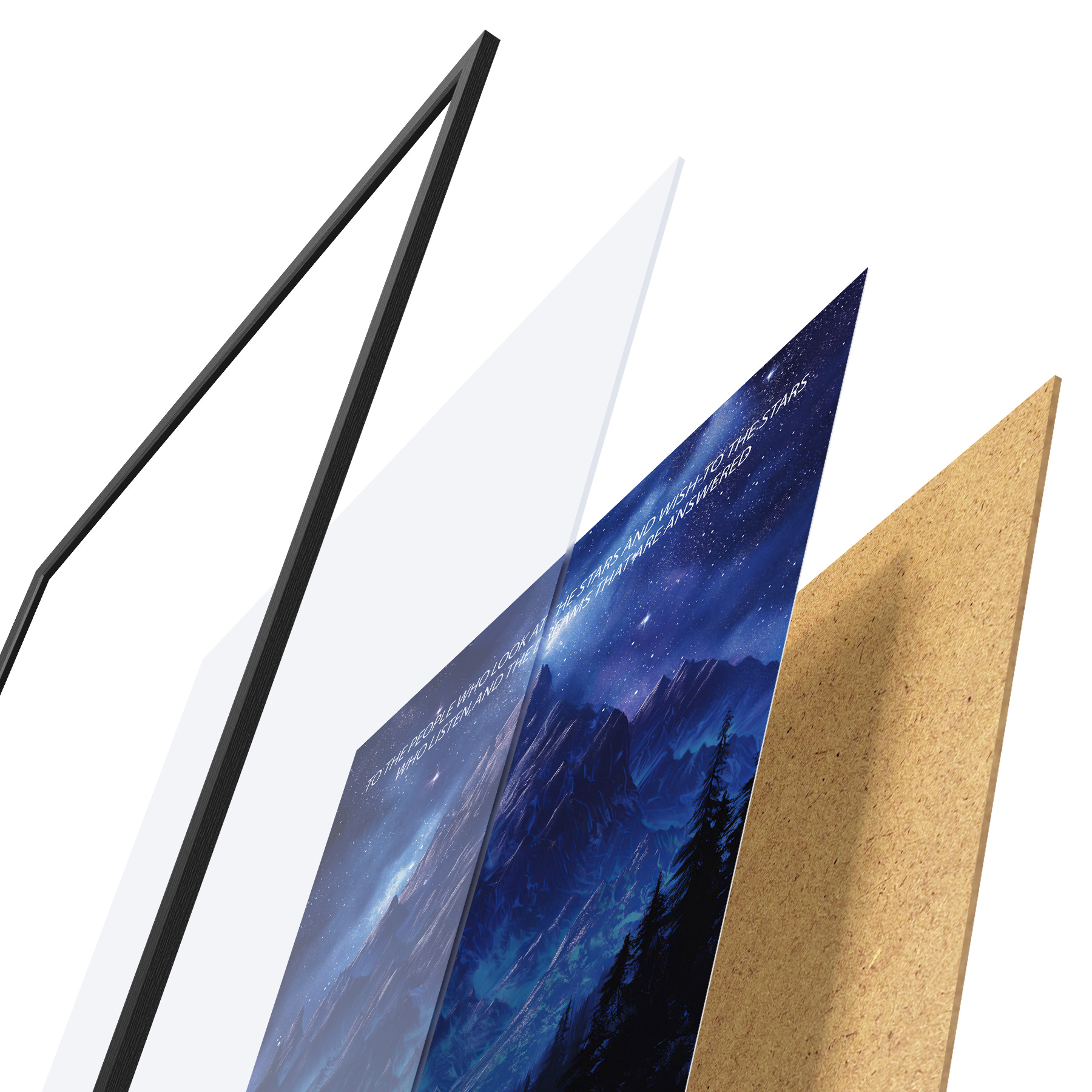 Plakatą sudaro rėmas, pleksiklas, atspausdintas vaizdas ir medžio drožlių plokštės pagrindas. Plakatą galima iš karto pakabinti ant sienos dėl kitoje pusėje esančių laikiklių.