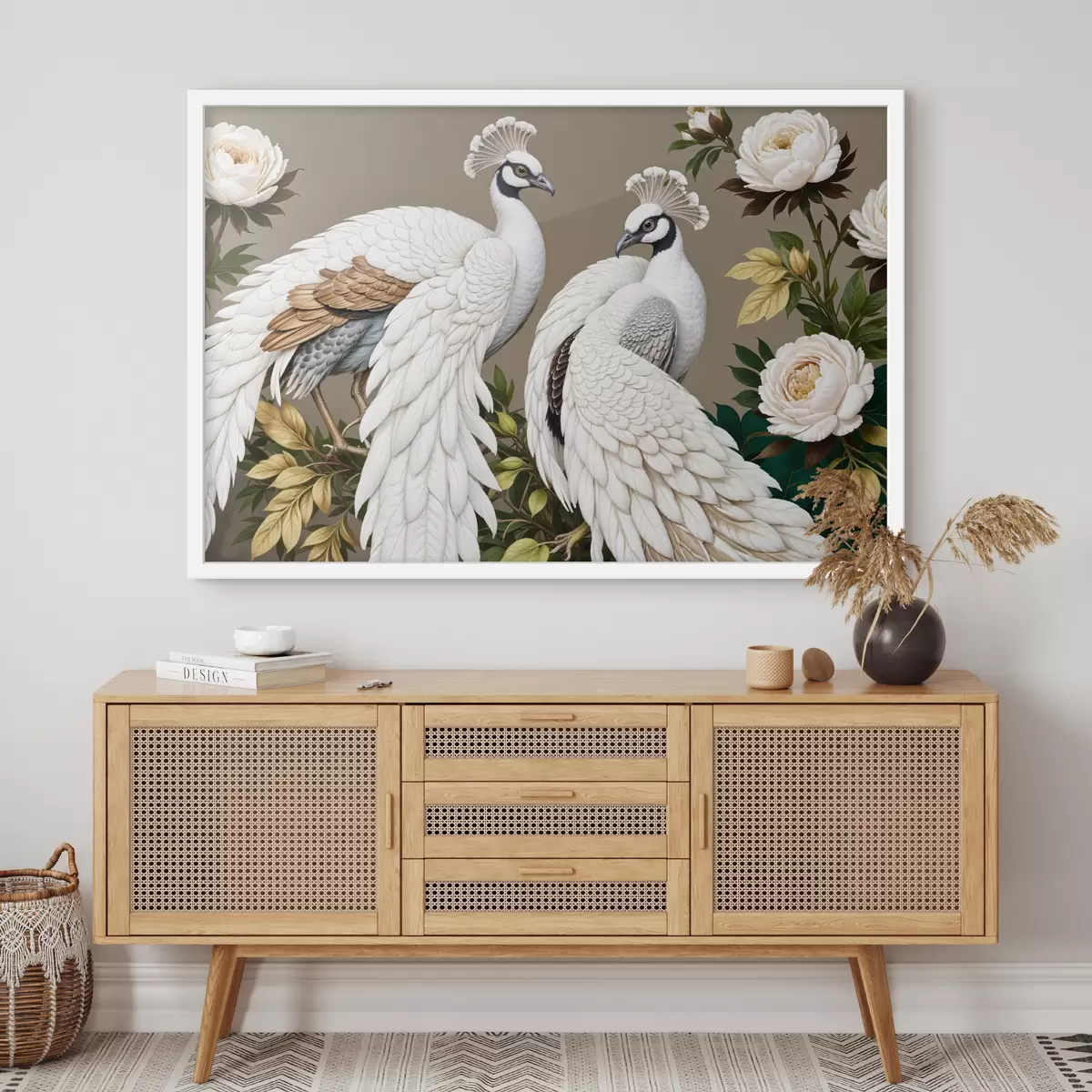 Plakatas Du balti povai puošniomis plunksnomis tupi ant šakos su gėlėmis Ne f40022