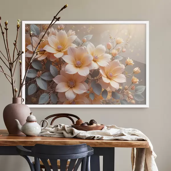 Plakatas Subtilus persikų spalvos jurginų žiedai žydi, su švelniais žiedlapiais neryškiame fone f40024