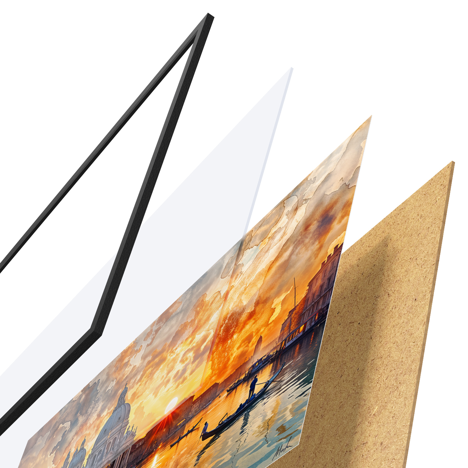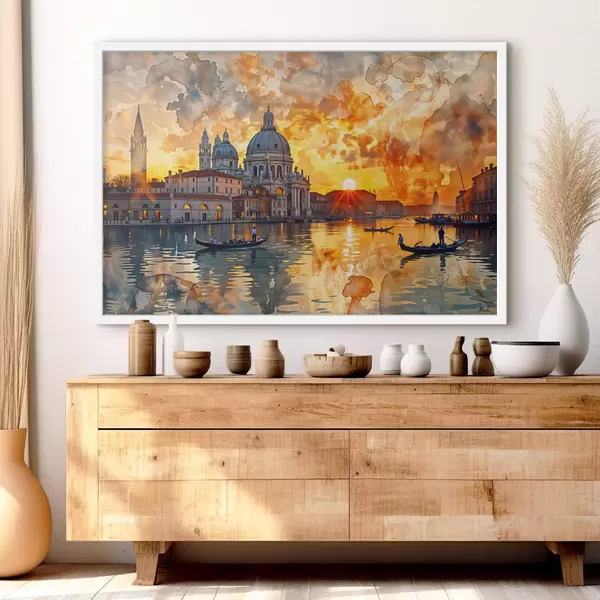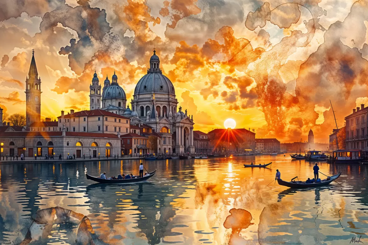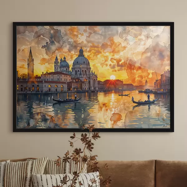Plakatas Spalvingas ir dramatiškas saulėlydis virš Didžiojo kanalo Venecijoje, Italijoje akvarelės menas f40027