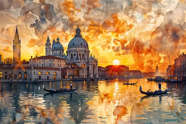 Plakatas Spalvingas ir dramatiškas saulėlydis virš Didžiojo kanalo Venecijoje, Italijoje akvarelės menas f40027
