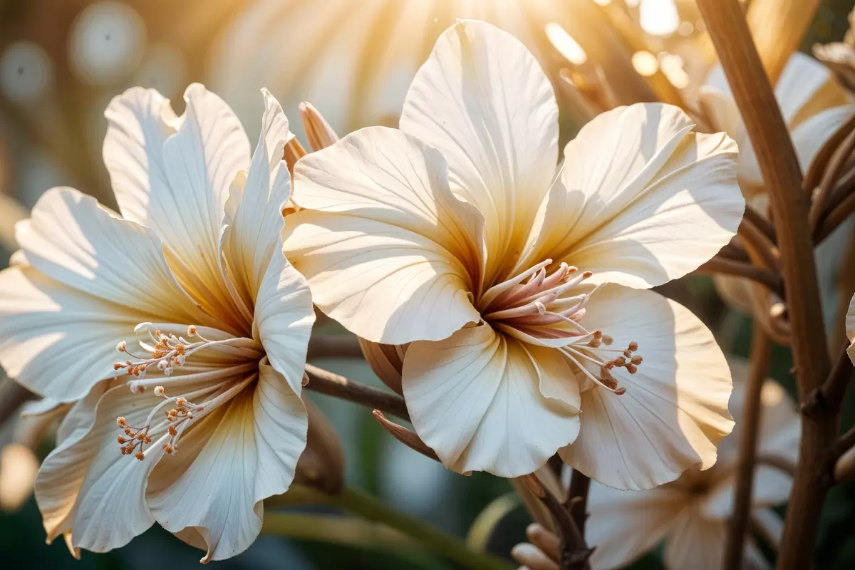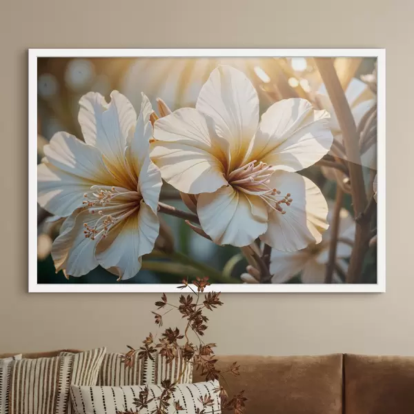 Plakatas Žydi baltos ir oranžinės hibisko gėlės su švelnaus fokusavimo fonu f40035