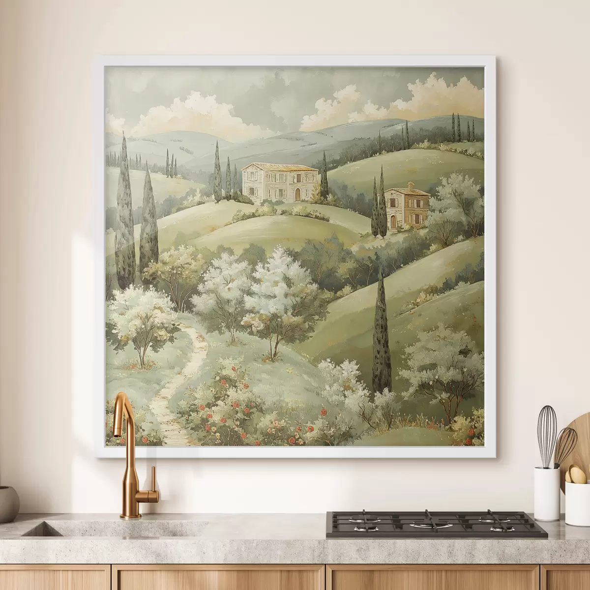 Plakatas Peizažas su vintažiniais namais, pastelinės žalios spalvos, akrilo piešinys, vasara Ne f40078