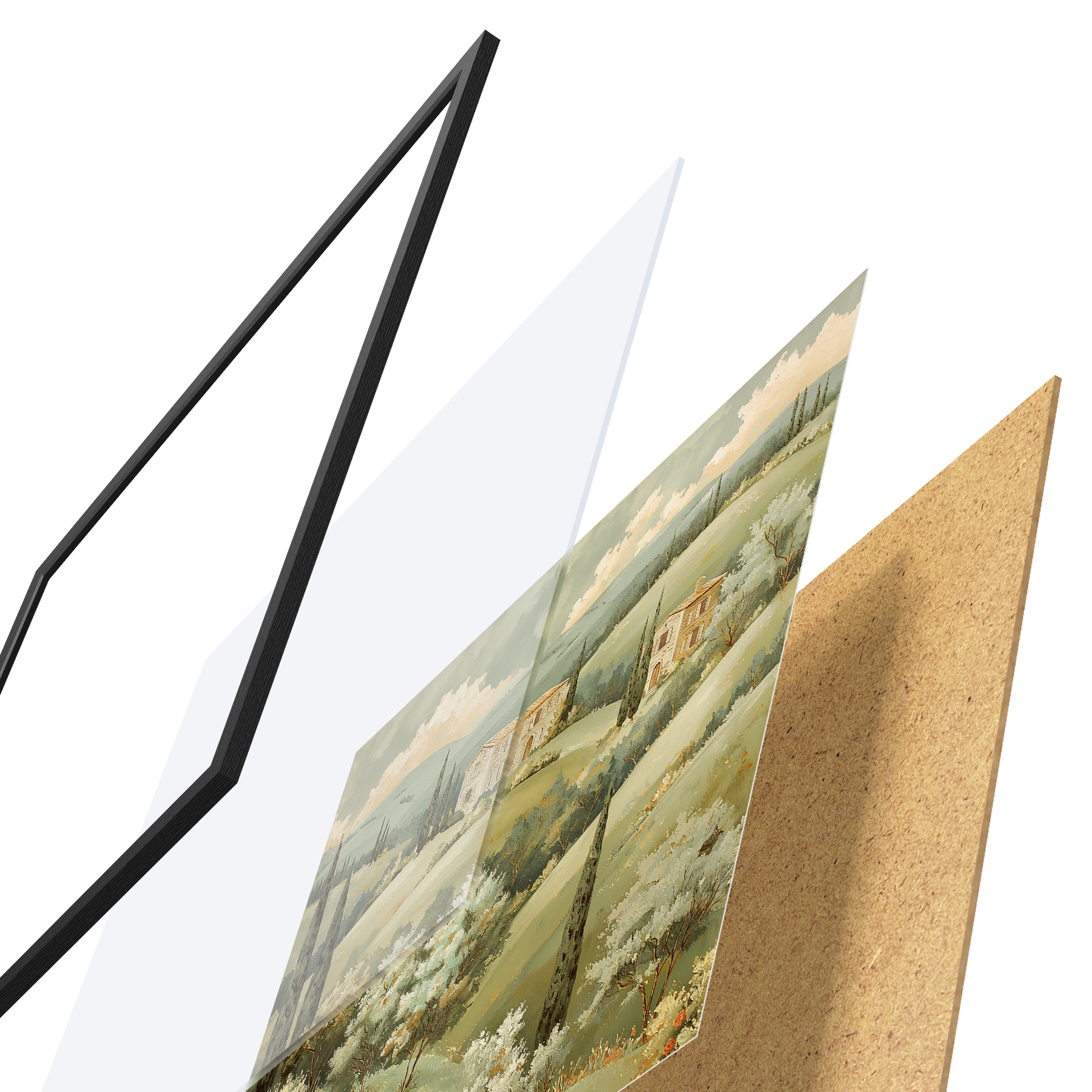 Plakatą sudaro rėmas, pleksiklas, atspausdintas vaizdas ir medžio drožlių plokštės pagrindas. Plakatą galima iš karto pakabinti ant sienos dėl kitoje pusėje esančių laikiklių.