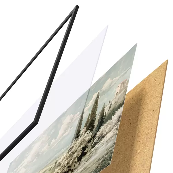 Plakatą sudaro rėmas, pleksiklas, atspausdintas vaizdas ir medžio drožlių plokštės pagrindas. Plakatą galima iš karto pakabinti ant sienos dėl kitoje pusėje esančių laikiklių.