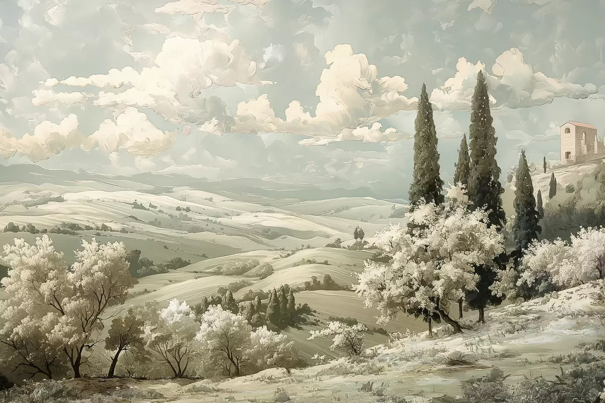 Plakatas Vasaros peizažas, vintažinis stilius, pastelinės spalvos, akrilo piešinys, pilis Ne f40084