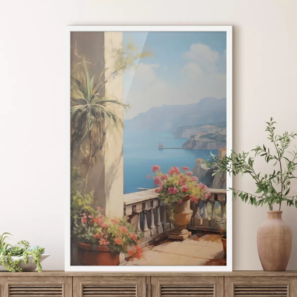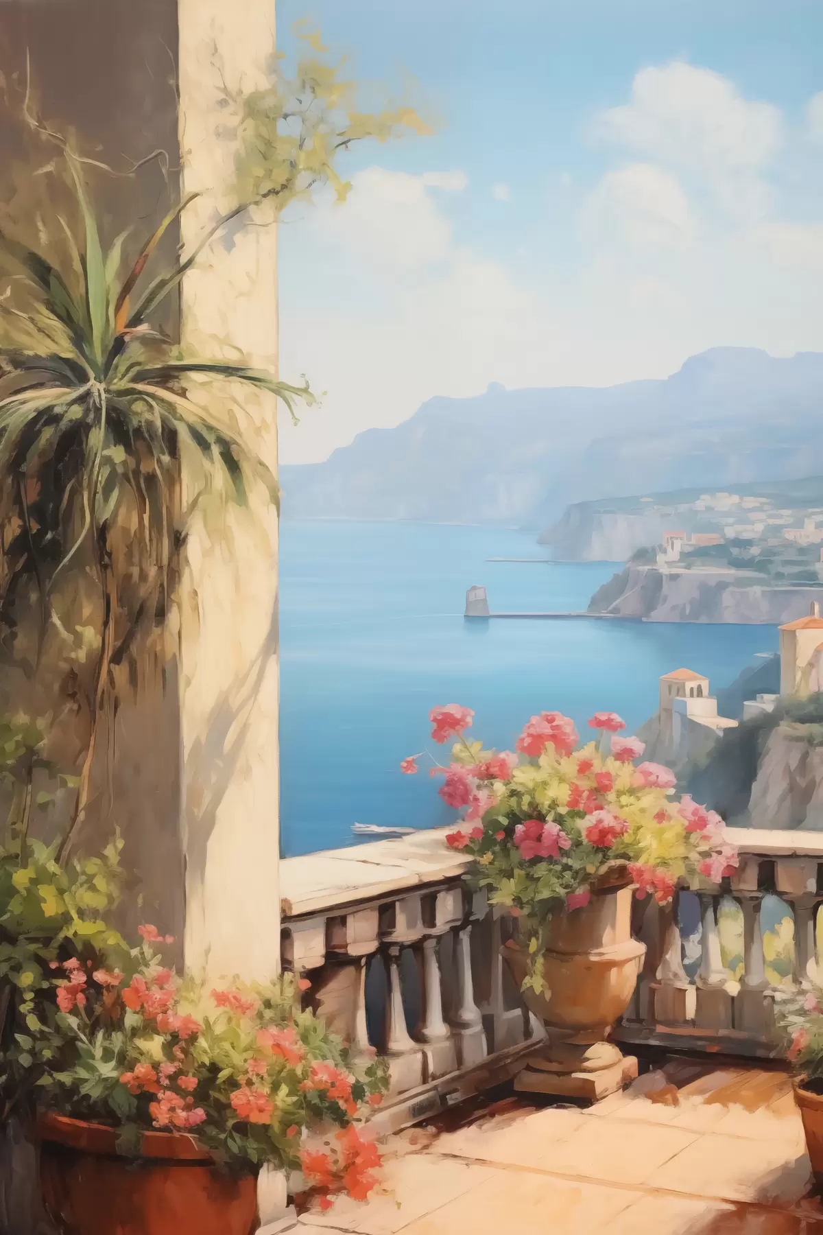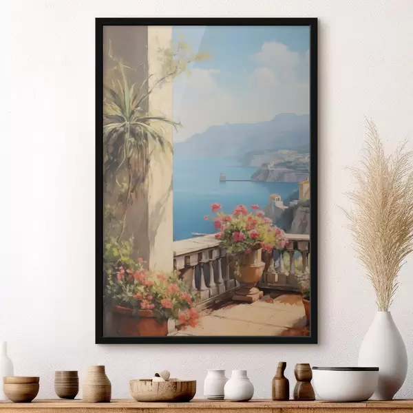 Plakatas Vazonas su gėlėmis balkone jūros įlankos ir kalnų fone aliejinės tapybos imitacija f40089