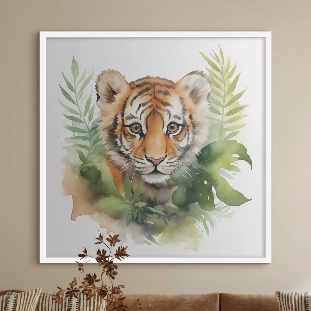 Plakatas Tigro portretas atogrąžų lapuose akvarelė Ne f40090