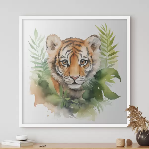 Plakatas Tigro portretas atogrąžų lapuose akvarelė Ne f40090