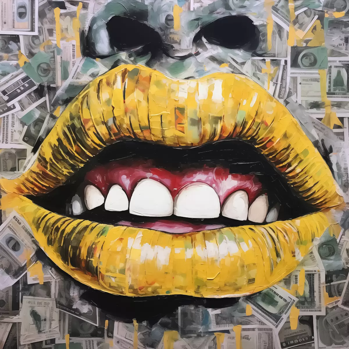 Plakatas Geltonos lūpos, balti dantys, veidas banknotuose, imituojantis aliejinę tapybą f40098