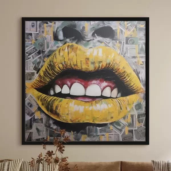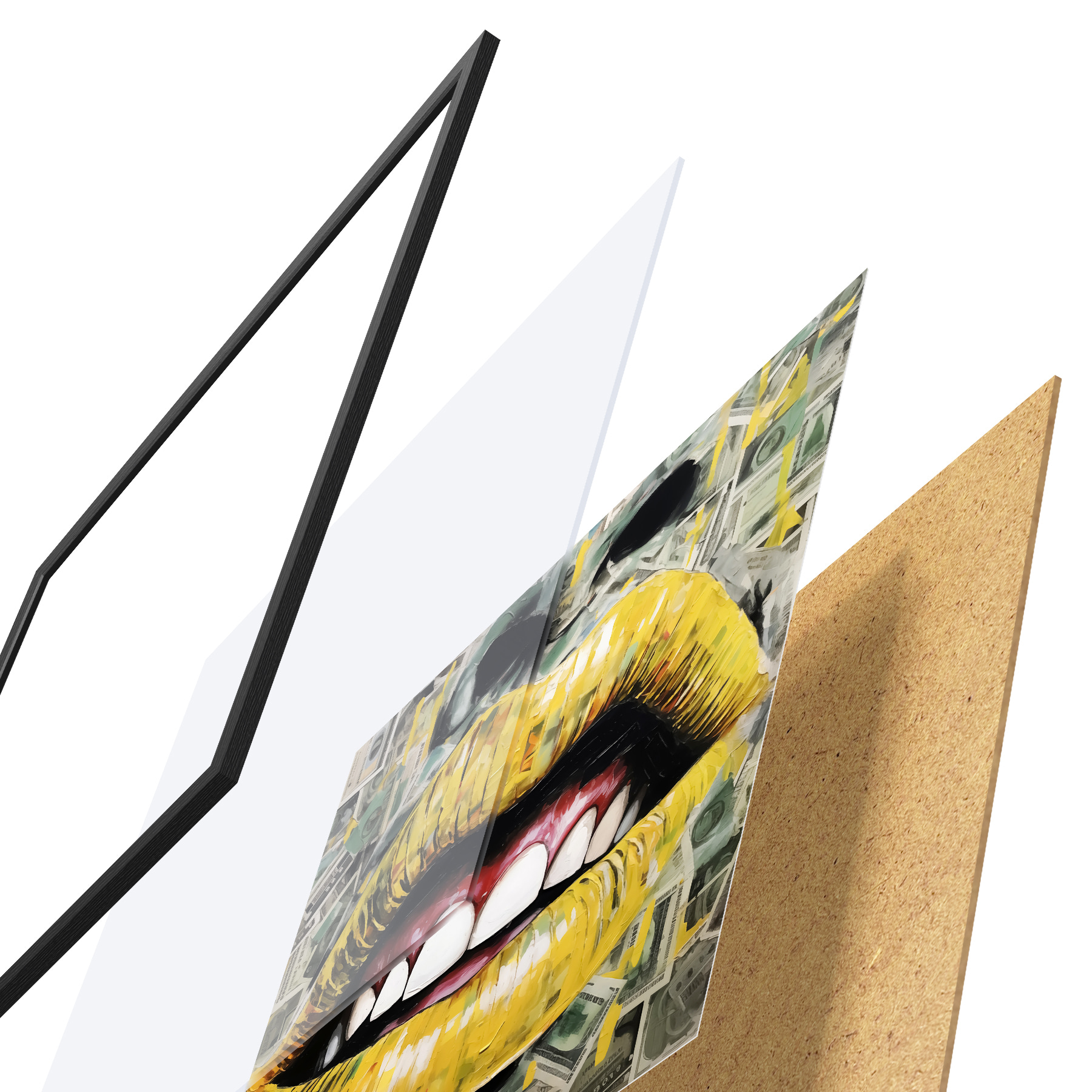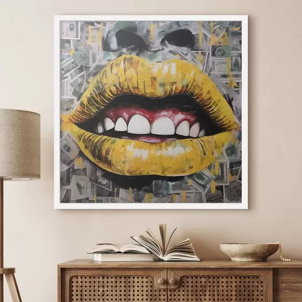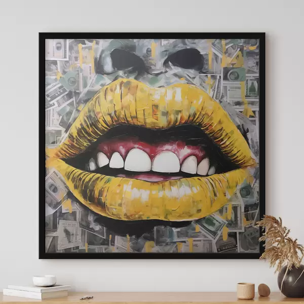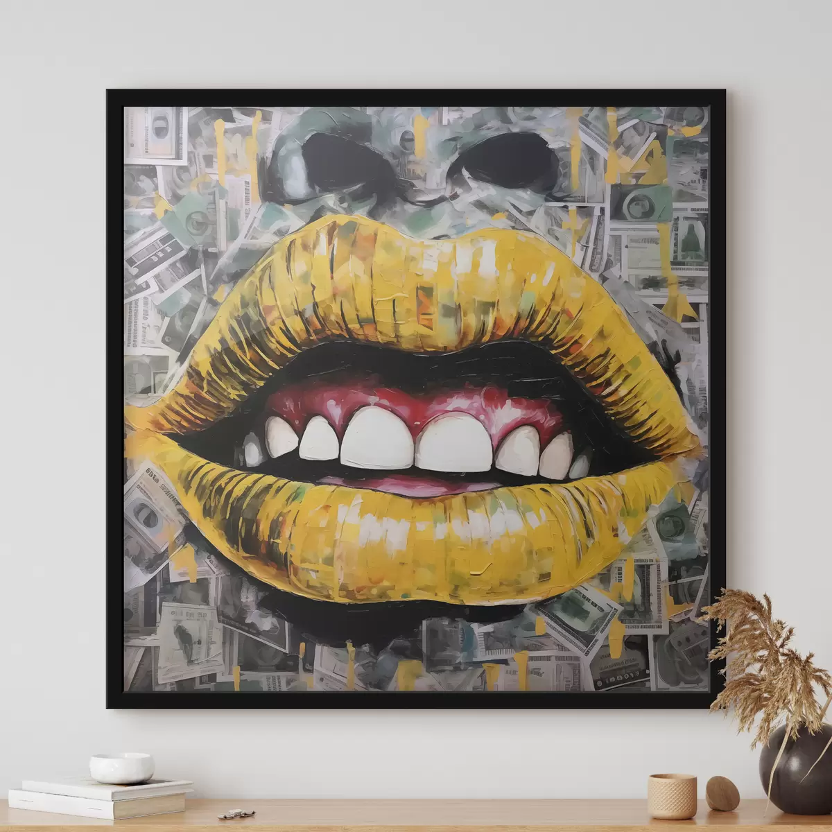 Plakatas Geltonos lūpos, balti dantys, veidas banknotuose, imituojantis aliejinę tapybą Ne f40098