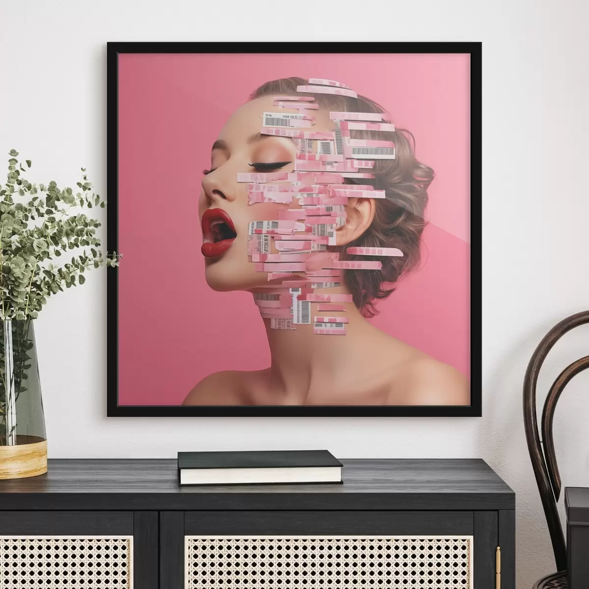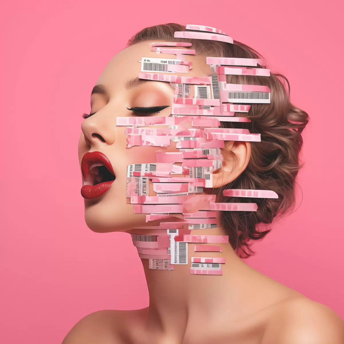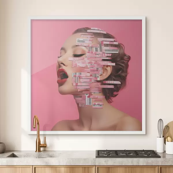 Plakatas Merginos portretas raudonomis lūpomis, padengtomis brūkšniniais kodais rožiniame fone f40101