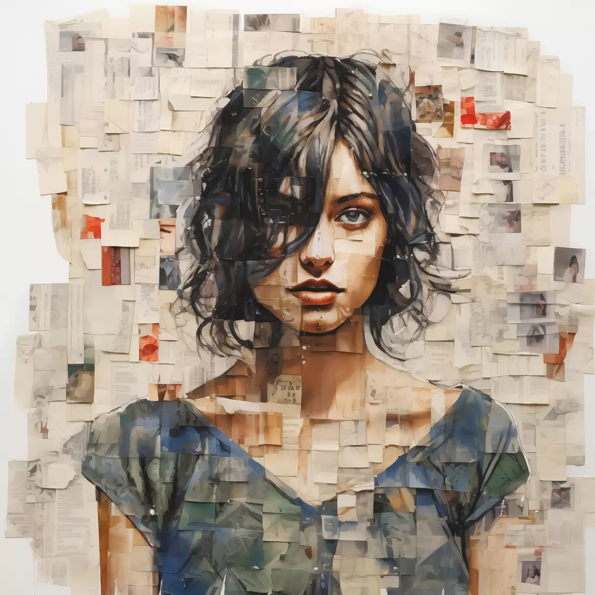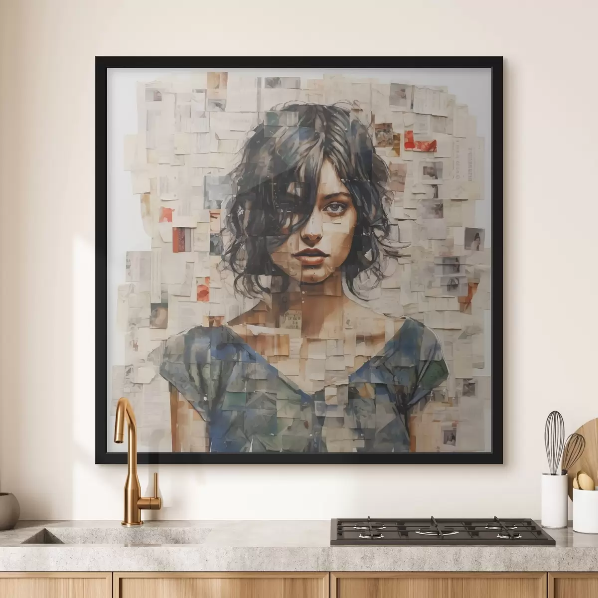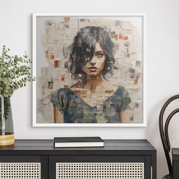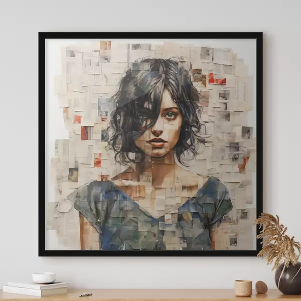 Plakatas Mergina garbanotais plaukais, apklijuota lipdukais, antspaudais ir brūkšniniais kodais f40104