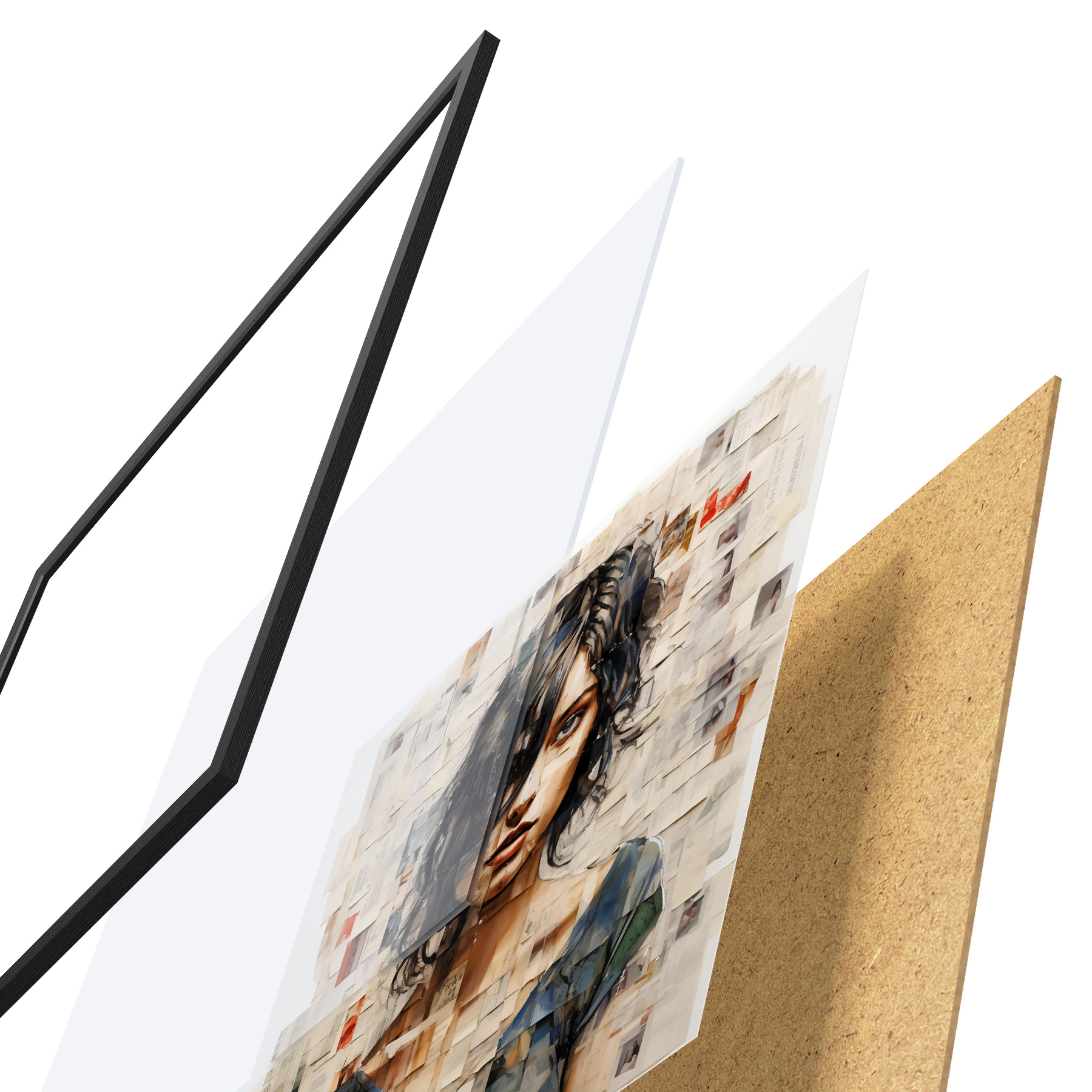 Plakatą sudaro rėmas, pleksiklas, atspausdintas vaizdas ir medžio drožlių plokštės pagrindas. Plakatą galima iš karto pakabinti ant sienos dėl kitoje pusėje esančių laikiklių.
