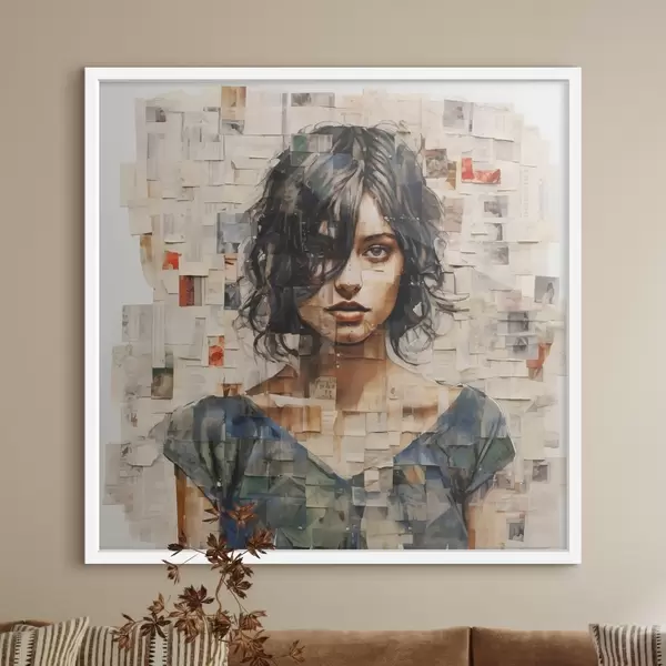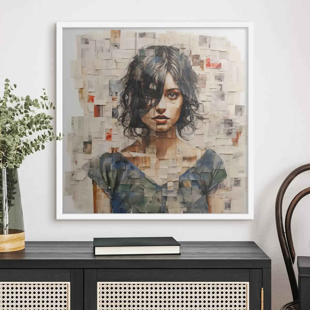 Plakatas Mergina garbanotais plaukais, apklijuota lipdukais, antspaudais ir brūkšniniais kodais f40104