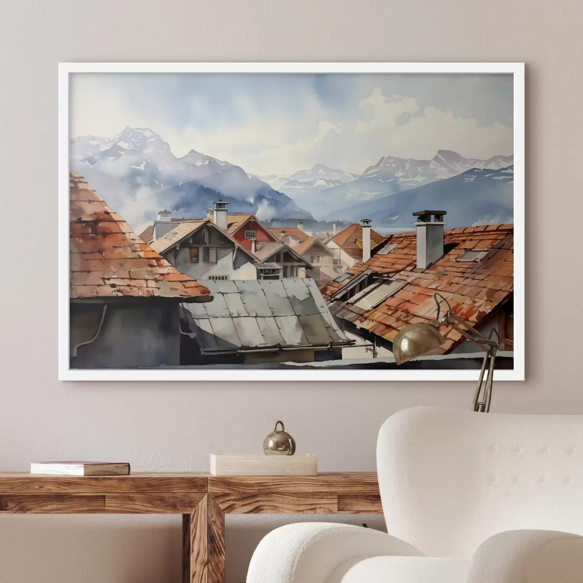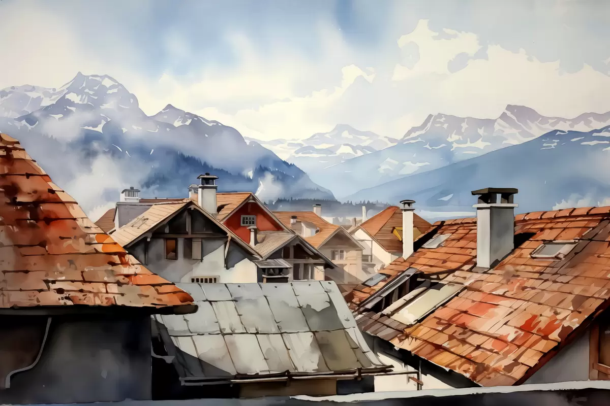 Plakatas Kaimo namų stogai akvarelės kalnų fone f40107