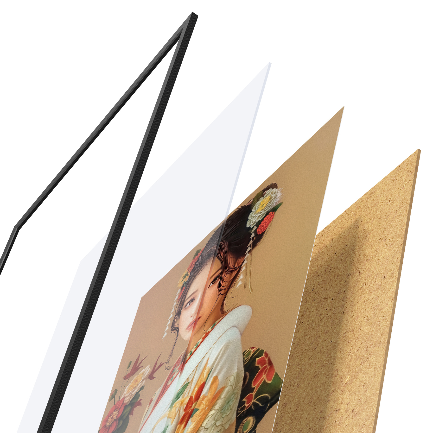 Plakatą sudaro rėmas, pleksiklas, atspausdintas vaizdas ir medžio drožlių plokštės pagrindas. Plakatą galima iš karto pakabinti ant sienos dėl kitoje pusėje esančių laikiklių.