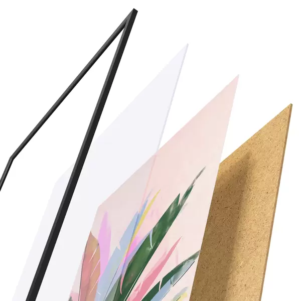 Plakatą sudaro rėmas, pleksiklas, atspausdintas vaizdas ir medžio drožlių plokštės pagrindas. Plakatą galima iš karto pakabinti ant sienos dėl kitoje pusėje esančių laikiklių.
