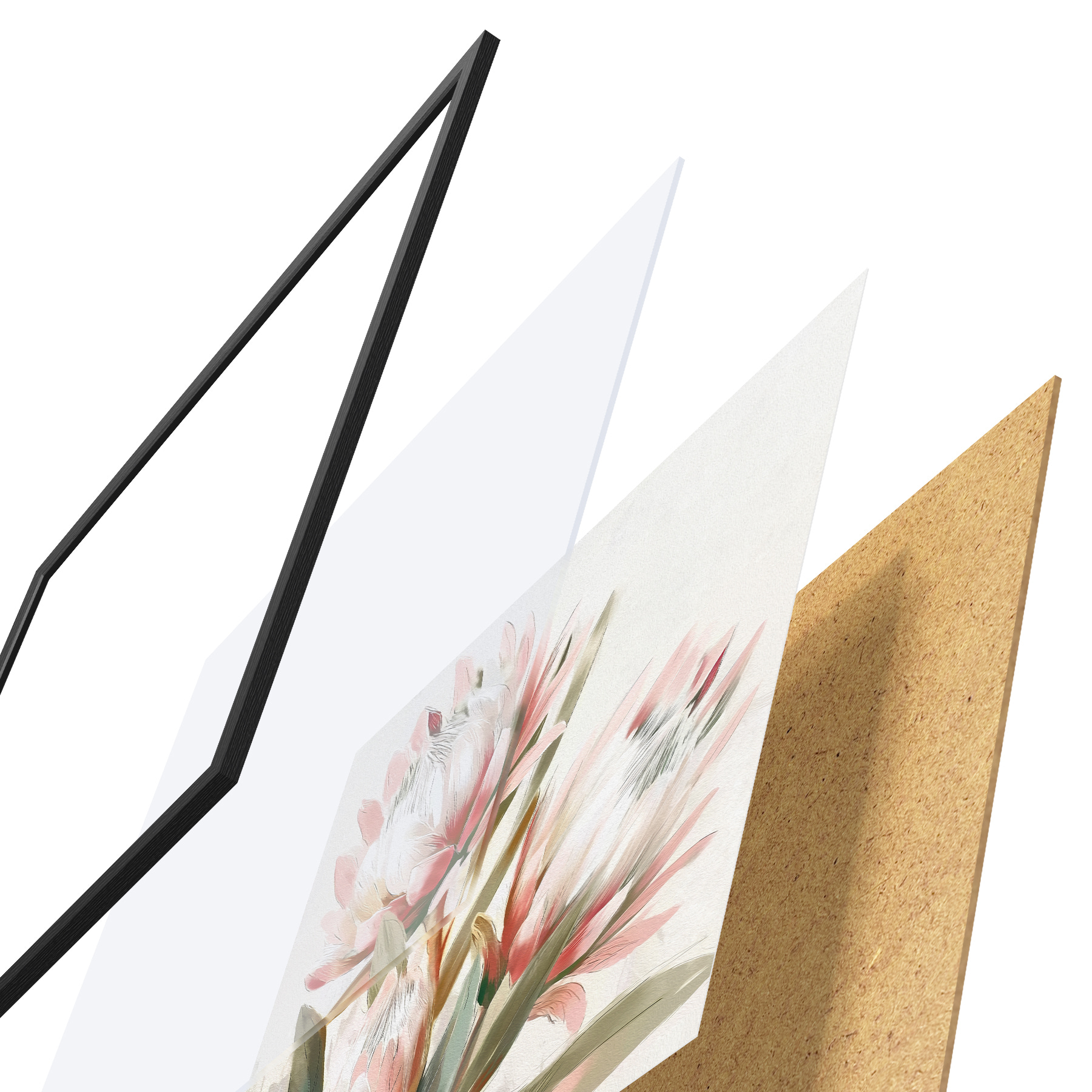 Plakatą sudaro rėmas, pleksiklas, atspausdintas vaizdas ir medžio drožlių plokštės pagrindas. Plakatą galima iš karto pakabinti ant sienos dėl kitoje pusėje esančių laikiklių.