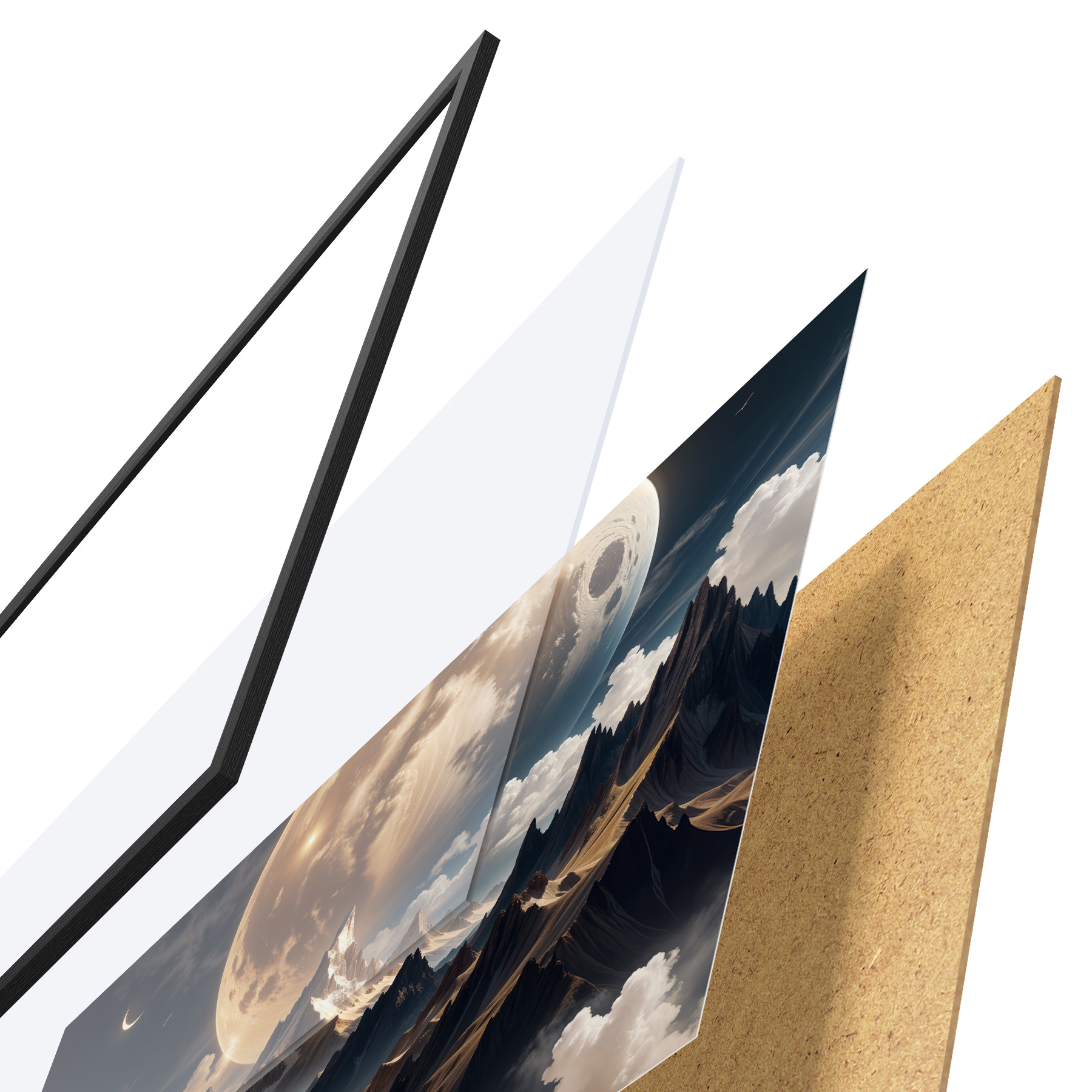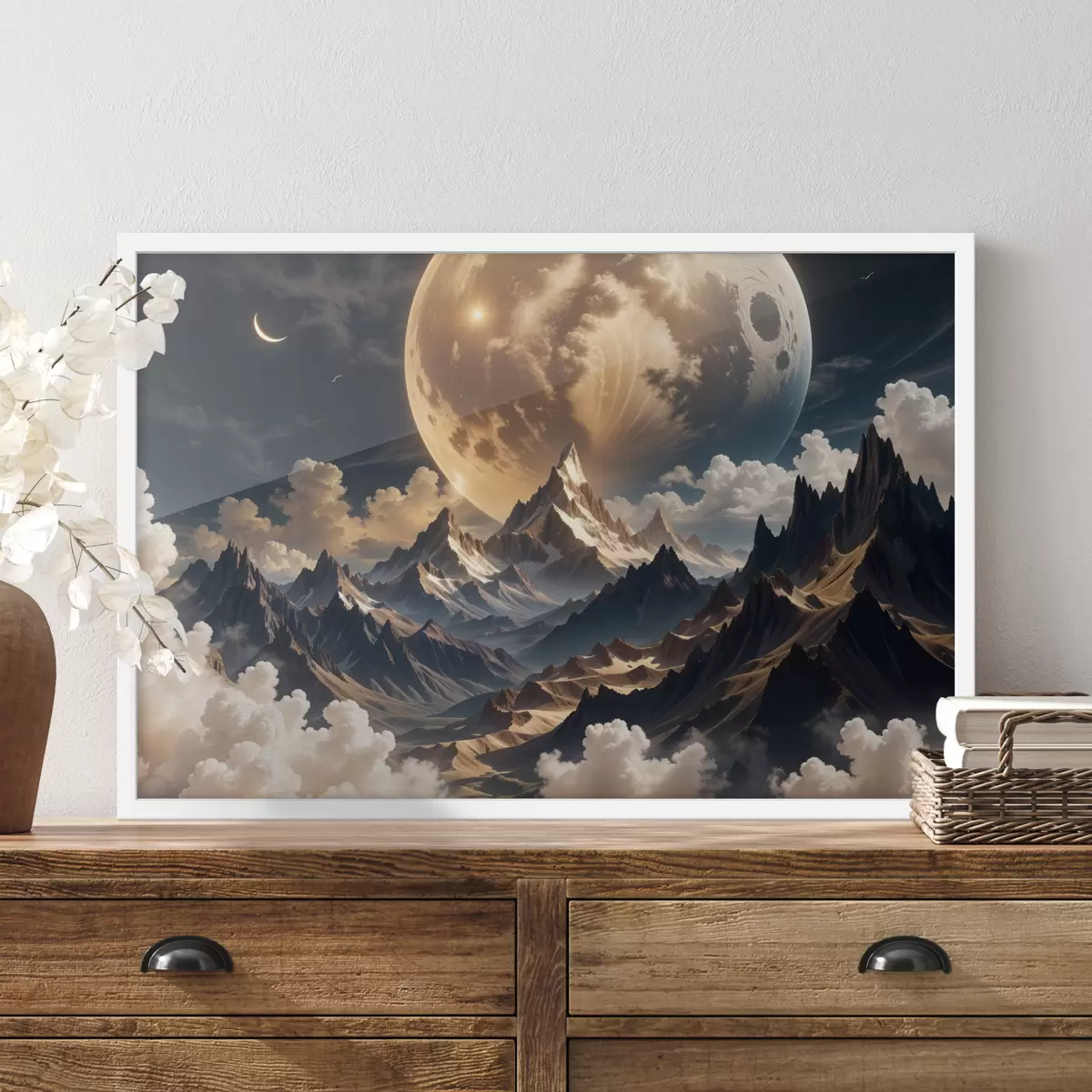 Plakatas Siurrealistinis peizažas su snieguotais kalnais po didžiule pilnatis, su šmaikščiais debesimis Ne f40147