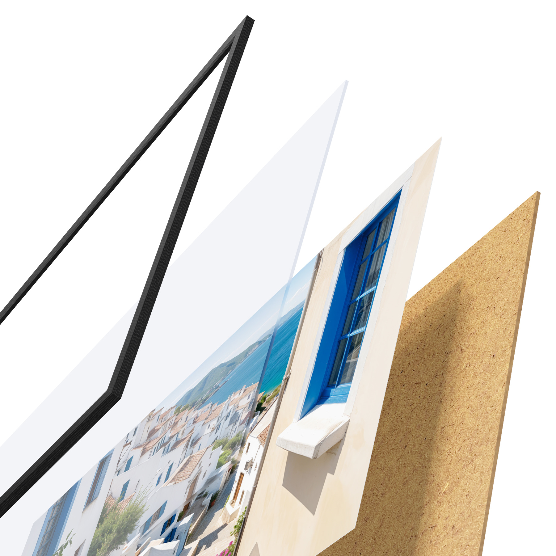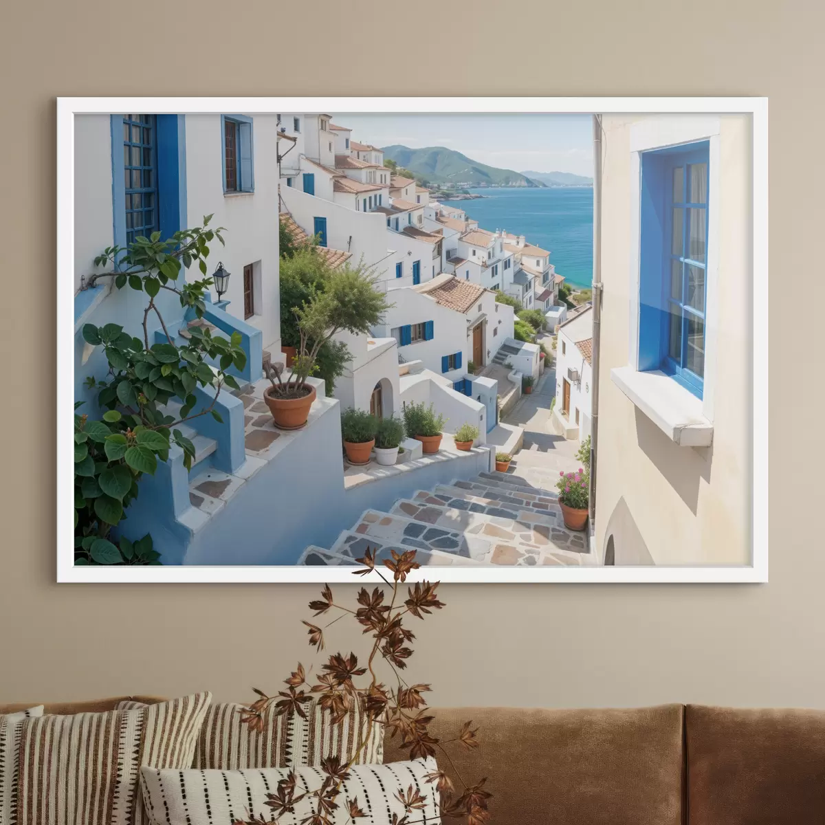 Plakatas Vaizdingas pakrantės miestelis su baltais pastatais, mėlynais langais ir siauromis gatvelėmis išklotais vazoniniais augalais Ne f40148